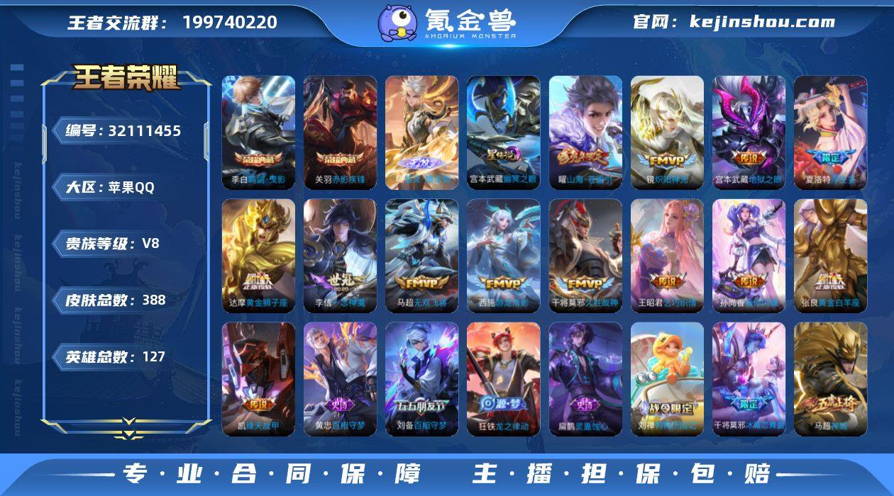 ·赤影疾锋·问心剑·器灵螭龙剑·神骥逐星野·愿照山河定·愿照九州拓·山海苍雷引·时雨天司·白虎志·无双飞将·齐天大圣·游龙清影·鲲天幕·可二次】w17548-苹果Q-127英雄-388皮肤-18王者印记-300铭文-贵族积分7w【贵族8】【2典藏·2无双·1星传说·22传说·2天幕·6按键】【因赛季更新游戏段付以上号为准!】 【英雄全皮】:孙权全皮,猪八戒全皮,蒙恬全皮,夏洛特全皮,司空震全皮,金蝉全皮,影全皮 【荣耀典藏】:李白鸣剑曳影,关羽赤影疾锋 【无双皮肤】:李信问心剑,曜器灵螭龙剑 【星元皮肤】:宫本武藏幽冥之眼 【天幕】:鲲天幕,共赏芳华天幕 【传说皮肤】:马超神骥逐星野,后羿神树通天,曹操万灵伏威,司空震愿照山河定,澜愿照九州拓,夏洛特浮生妄,孙悟空齐天大圣,曜山海苍雷引,孙尚香音你闪耀,马超无双飞将,王昭君乞巧织情,西施游龙清影,诸葛亮时雨天司,铠绛天战甲,镜炽阳神光,虞姬启明星使,李信一念神魔,张良黄金白羊座,干将莫邪久胜战神,达摩黄金狮子座,百里玄策白虎志,宫本武藏地狱之眼 【限定皮肤】:白起狰,狄仁杰阴阳师,赵云皇家上将,赵云引擎之心,墨子神迹守卫,墨子降魔,嬴政优雅恋人,鲁班七号狮舞东方,庄周高山流水,高渐离玩趣恶龙,钟无艳超时空战士,扁鹊奇幻香踪,芈月重明,芈月白晶晶,芈月幻夜卜梦,吕布猎兽之王,吕布御风骁将,周瑜赤莲之焰,元歌云间偶戏,元歌无心,夏侯惇朔风刀,甄姬落雪兰心,曹操烛龙,典韦穷奇,马可波罗暗影游猎,马可波罗山海玄木吟,狄仁杰魔术师,狄仁杰万华元夜,达摩星际陆战队,达摩沙漠行僧,项羽海滩派对,老夫子醍醐杖,老夫子航海奇遇记,关羽冰锋战神,程咬金演武夺筹,韩信逐梦之影,韩信傲雪梅枪,王昭君午后时光,兰陵王金庭之子,花木兰青春决赛季,花木兰默契交锋,亚瑟潮玩骑士王,孙悟空大圣娶亲,孙悟空孙行者,孙悟空...