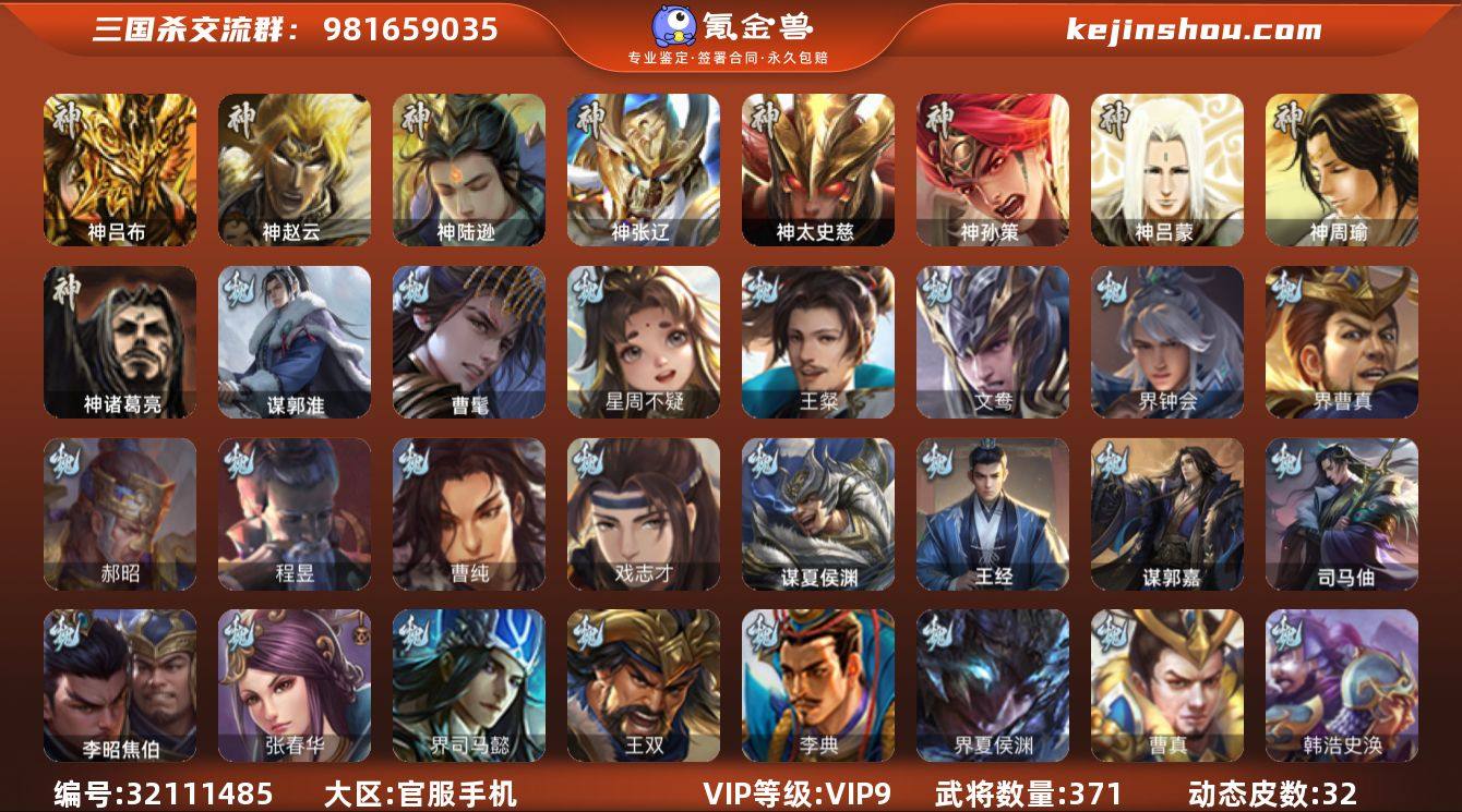【14789411】官阶:大将军;VIP等级:VIP9;史诗武将数量:42;动态皮肤数量:32;武将总数:371;史诗宝珠数量:9;将魂数量:1732;神将:7;魏国史诗武将:14;蜀国史诗武将:7;吴国史诗武将:6;群史诗武将:15 神吕布,神赵云,神陆逊,神张辽,神太史慈,神孙策,神诸葛亮,曹髦,星周不疑,王粲,界钟会,界曹真,郝昭,曹纯,戏志才,谋郭淮,程昱,谋诸葛亮,谋赵云,谋马超,沙摩柯,谯周,花鬘,势魏延,周处,骆统,界徐盛,势陆郁生,文鸯,左慈,郑玄,张让,星黄忠,星甘宁,麹义,公孙康,卑弥呼,谋张角,许攸,星董卓,兀突骨,士燮,司马昭,神吕蒙,神周瑜,SP关羽,SP曹仁,SP蔡文姬,乐进,曹昂,诸葛诞,朱灵,文聘,SP姜维,张春华,钟会,曹冲,郭淮,满宠,界王异,界曹操,界司马懿,界夏侯惇,界张辽,界许褚,界郭嘉,李典,曹真,韩浩史涣,陈群,曹休,钟繇,司马朗,王基,李通,郭皇后,孙资刘放,界甄姬,鲁芝,蒯越蒯良,界典韦,界徐晃,界曹丕,毌丘俭,界邓艾,张恭,界曹植,卞夫人,蔡贞姬,袁涣,王双,崔琰,毛玠,阮慧,谋徐晃,谋于禁,牵招,李昭焦伯,王经,司马伷,谋郭嘉,谋夏侯渊,界夏侯渊,势陈到,SP孙尚香,关银屏,夏侯霸,马良,关兴张苞,廖化,界马岱,关平,简雍,刘封,界法正,界关兴张苞,界刘备,界关羽,界张飞,界赵云,界马超,SP徐庶,吴懿,周仓,张松,刘谌,糜竺,马忠,孙乾,黄皓,吴苋,秦宓,赵统赵广,严颜,界伊籍,界卧龙诸葛,界孟获,界祝融,陈到,界刘禅,吕凯,张翼,陈震,费祎,糜夫人,王甫赵累,界周仓,宗预,彭羕,谋庞统,谋黄月英,界张嶷,谋张飞,吴班,霍峻,诸葛果,界魏延,蒋琬费祎,糜芳傅士仁,甘夫人,势孙韶,鲁肃,孙茹,凌操,大乔小乔,诸葛恪,诸葛瑾,孙鲁育,程普,韩当,潘璋马忠,虞翻,界周泰,界甘宁,界吕蒙,界黄盖,界周瑜,界大乔,界陆逊,孙鲁班,朱桓,顾雍,孙休,朱治,全琮,阚泽,孙登,徐氏,薛综,界孙尚香,潘濬,陆绩,孙亮,严畯,界孙坚,吕岱,周鲂,周妃,界孙策,界张昭张纮,许贡,卫温诸葛直,界吴国...