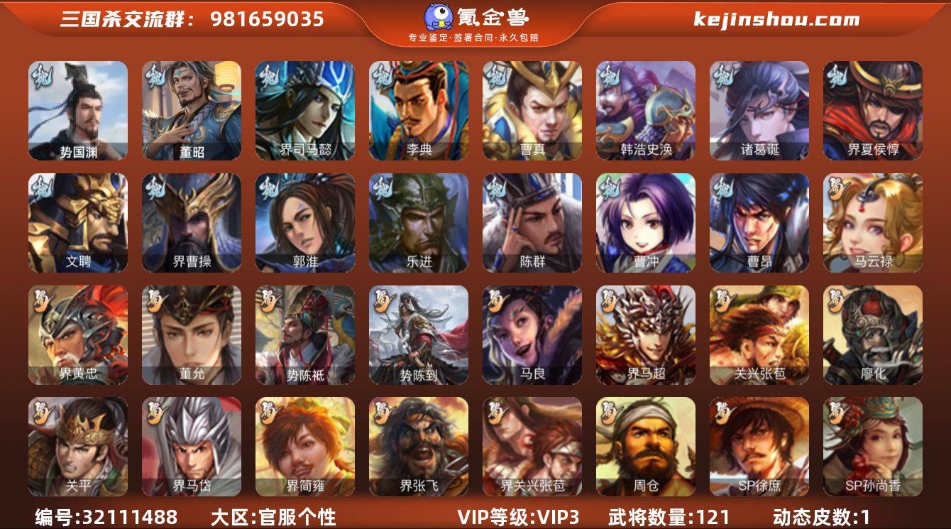 【14789406】官阶:先锋将军;VIP等级:VIP3;史诗武将数量:5;动态皮肤数量:1;武将总数:121;史诗宝珠数量:0;将魂数量:950;神将:0;魏国史诗武将:0;蜀国史诗武将:3;吴国史诗武将:1;群史诗武将:0 势国渊,马云騄,界黄忠,董允,界徐盛,乐进,曹昂,诸葛诞,文聘,曹冲,郭淮,界曹操,界司马懿,界夏侯惇,李典,曹真,韩浩史涣,陈群,董昭,势陈到,SP孙尚香,马良,关兴张苞,廖化,界马岱,关平,界关兴张苞,界刘备,界张飞,界赵云,界马超,SP徐庶,吴懿,周仓,张松,界简雍,王甫赵累,彭羕,甘夫人,势陈祗,诸葛恪,孙鲁育,程普,韩当,潘璋马忠,虞翻,界甘宁,界黄盖,界大乔,界陆逊,孙鲁班,岑昏,界朱治,张布,伏完,界袁术,张宝,伏皇后,华雄,袁术,公孙瓒,公孙渊,胡车儿,诸葛果-蛇年限定(动态),马云騄-明良千古(动态)