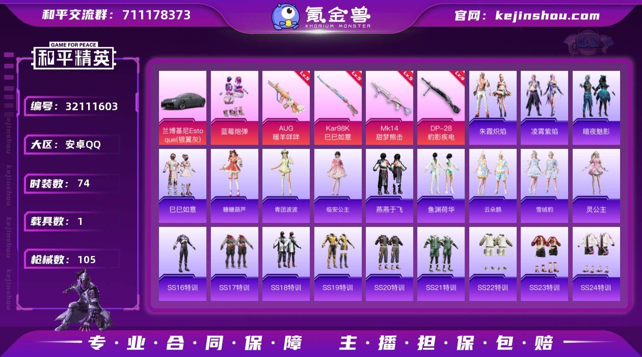 【AZH2983】安卓 手Q【蓝莓炮弹 1载具】1粉装-4特效枪-1载具-0粉色飞行器-36843热力值-1王牌印记-74套装-105枪皮 【粉色套装】:粉装-蓝莓炮弹 【粉色枪皮等级】:AUG-暖羊咩咩(五级),Kar98K-巳巳如意(五级),Mk14-甜梦熊击(五级),DP-28-豹影疾电(四级) 【粉色载具】:兰博基尼Estoque(银翼灰) 【粉色枪皮】:AUG-暖羊咩咩,Kar98K-巳巳如意,Mk14-甜梦熊击,DP-28-豹影疾电 【粉色降落伞】:暗夜玫瑰降落伞,海渊国主降落伞,恐龙拽拽降落伞,江南烟雨降落伞,精灵梦叶罗丽降落伞,千金淑猫降落伞,智耀战神降落伞 【稀有套装】:套装-巳巳如意,套装-糖糖葫芦,套装-青团波波,角色-临安公主,套装-燕燕于飞,套装-鱼渊荷华,套装-云朵鹅,套装-雪绒豹,角色-灵公主,套装-朱霞炽焰,套装-凌霄紫焰 【稀有枪皮】:AKM-彩虹符号,AKM-海渊国主,AKM-环太平洋,AKM-胡桃卫兵,AKM-虎虎生威,SCAR-L-玉兔迎春,SCAR-L-龙宫之主,M416-夜灯,M416-蓝色火焰,GROZA-异彩先驱,GROZA-紫翼圣骑,AUG-流星咚咚,QBZ-彩虹符号,QBZ-飞驰魅影,M762-瑞龙福将,M762-云朵鹅,Mk47-洛神天依,G36C-暗夜玫瑰,AC-VAL-天降萌叽,蜜獾-天降萌叽,蜜獾-娇憨猪猪,ARX-凌霄紫焰,UZI-娇憨猪猪,UZI-炫彩节奏,UMP45-海渊国主,UMP45-生命誓言,Vector-暗夜玫瑰,汤姆逊-异彩先驱,汤姆逊-智耀战神,MP5K-异彩先驱,JS9-凌霄紫焰,P90-飞驰魅影,P90-巳巳如意,Kar98K-炫彩节奏,Kar98K-飞驰魅影,M24-影袭,SKS-炫彩节奏,Mini14-异彩先驱,Mini14-海渊国主,Mini14-绯穹魔姬,Win94-瑞龙福将,SLR-娇憨猪猪,AMR-喜羊羊与灰太狼,SVD-云朵鹅,S686-橘柚倾心,S1897-飞驰魅影,S12K-瑞龙福将,S12K-娇憨猪猪,DBS-幻彩电音,SPAS-12-云朵鹅,M249-破晓战魂,MG3-瑞龙福将,MG-36-凌霄紫焰,P92-流星咚咚,P92-凌霄紫焰,蝎式...