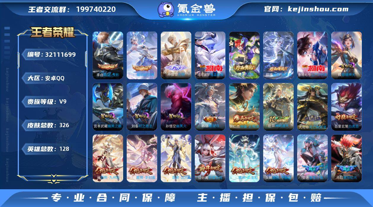 贵族等级:V9 典藏皮肤数:2 珍品无双皮肤数:0 无双皮肤数:1 珍品传说皮肤数:4 传说皮肤数:48 史诗皮肤数:99 皮肤数:326 英雄数:128 段位:荣耀王者