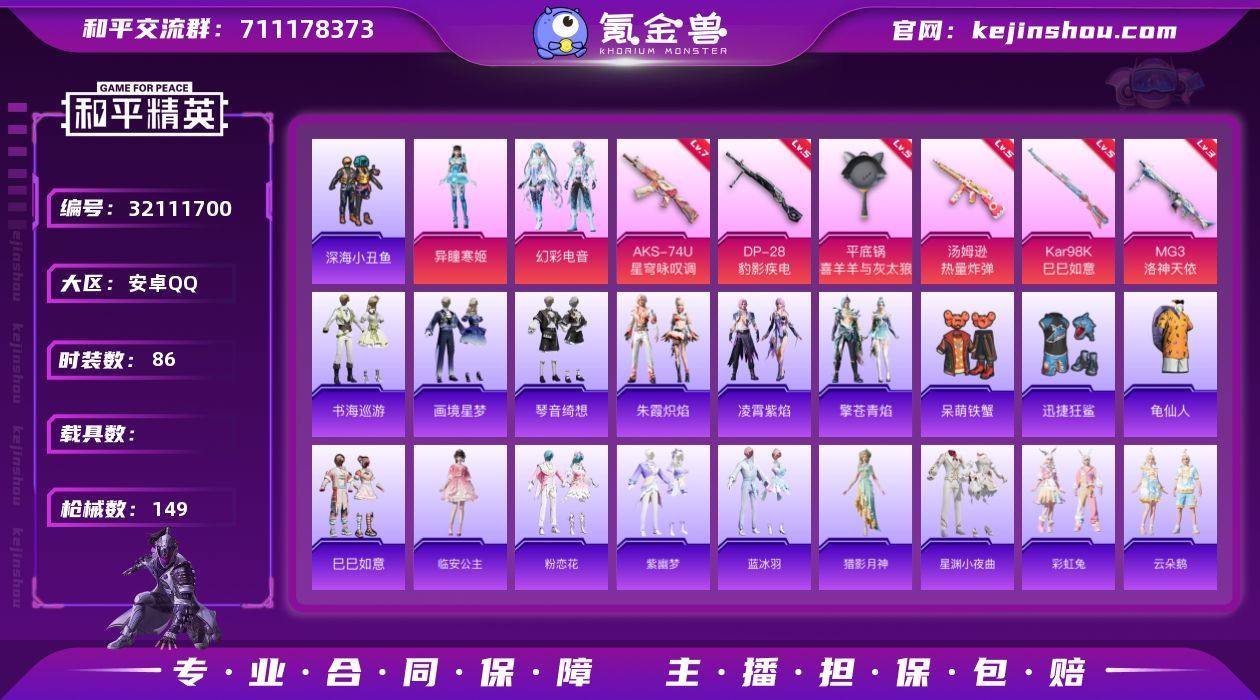安卓 手Q-3粉装-9特效枪-0载具-2粉色飞行器-41229热力值-6王牌印记-86套装-149枪皮 【热门品类】:套装-深海小丑鱼,套装-龟仙人 【粉色套装】:粉装-幻彩电音,角色-异瞳寒姬,角色-虎痴许褚 【粉色枪皮等级】:ACE32-萌骑漫游(三级),UMP45-萌骑冒险(二级),汤姆逊-热量炸弹(五级),AKS-74U-星穹咏叹调(七级),Kar98K-巳巳如意(五级),Mk14-福马献瑞(五级),DP-28-豹影疾电(五级),MG3-洛神天依(三级),平底锅-喜羊羊与灰太狼(六级) 【粉色枪皮】:ACE32-萌骑漫游,UMP45-萌骑冒险,汤姆逊-热量炸弹,AKS-74U-星穹咏叹调,Kar98K-巳巳如意,Mk14-福马献瑞,DP-28-豹影疾电,MG3-洛神天依,平底锅-喜羊羊与灰太狼 【粉色飞行器】:炫彩糖果飞行器,幻星舰长飞行器 【粉色降落伞】:星之彼岸降落伞,环太平洋降落伞,千金淑猫降落伞,星穹咏叹调降落伞,幻星舰长降落伞,绯穹魔姬降落伞,炫彩糖果降落伞 【稀有套装】:套装-龟仙人,套装-巳巳如意,套装-雪国风尚,套装-炫彩糖果,套装-马上有钱,角色-临安公主,套装-粉恋花,套装-紫幽梦,套装-蓝冰羽,角色-猎影月神,套装-星渊小夜曲,套装-彩虹兔,套装-云朵鹅,套装-雪绒豹,套装-蜜露汐语,套装-朱霞炽焰,套装-凌霄紫焰,套装-擎苍青焰,套装-书海巡游,套装-画境星梦,套装-琴音绮想,套装-雨过天青,套装-红釉青花 【稀有枪皮】:AUG-冰晶雪宝,AKM-彩虹符号,AKM-破晓战魂,AKM-龙的传人,M16A4-幻世战舞者,SCAR-L-夜灯,M416-红色方程式,M416-蓝色火焰,GROZA-影袭,GROZA-荧海星豚,AUG-耀粉歌者,QBZ-洛神天依,M762-天降萌叽,M762-彩虹符号,M762-云朵鹅,Mk47-洛神天依,G36C-星穹咏叹调,AC-VAL-天降萌叽,蜜獾-天降萌叽,蜜獾-虎痴许褚,蜜獾-绯穹魔姬,ACE32-画境星梦,ARX-凌霄紫焰,UZI-啾咪啾咪,UZI-天降萌叽,UMP45-夜灯,UMP45-蓝色...