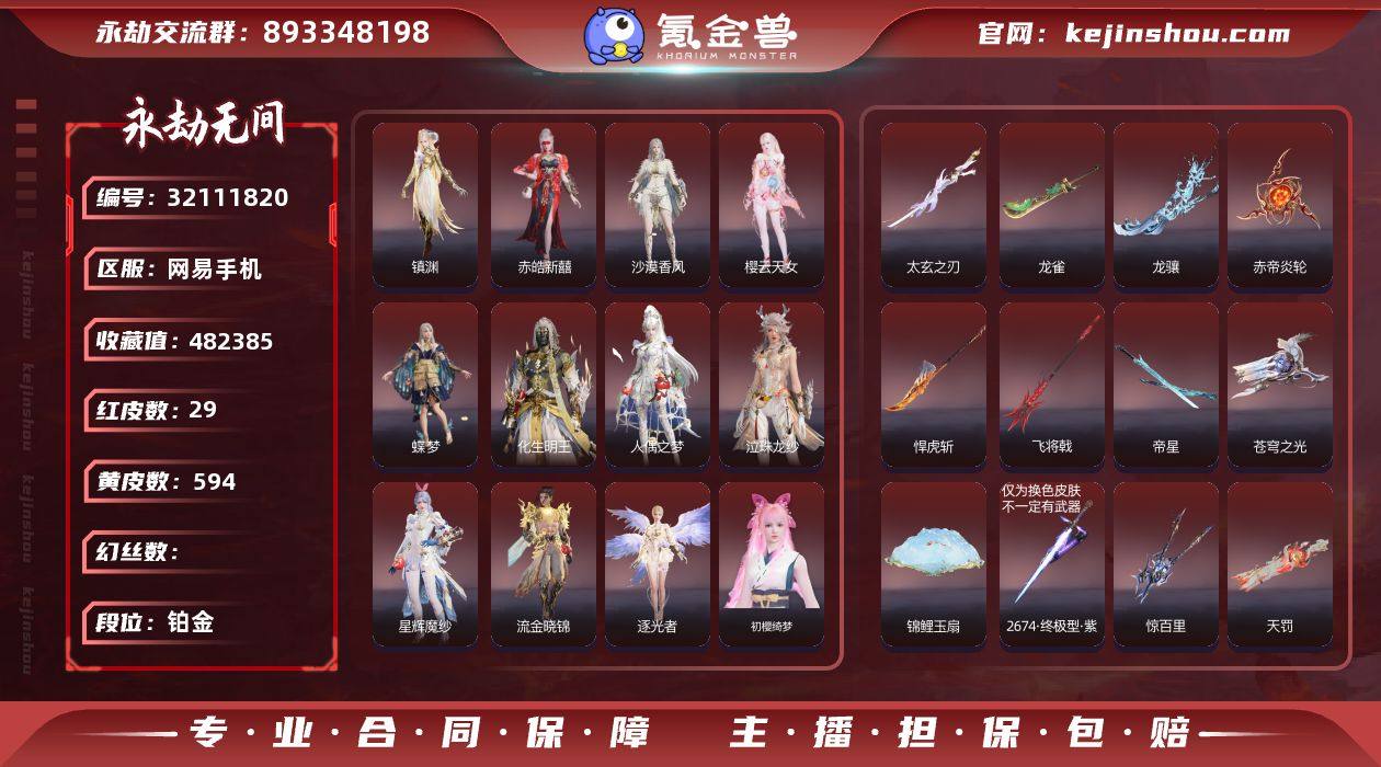 红皮数:29 黄皮数:594 等级:305 收藏值:482385 段位:铂金 通行证:已升级 征神通行证:已升级 版本:免费版 网易支付状态:可注销 换绑冷却:无冷却 是否绑定手游账号:已绑定手游 是否支持人脸包赔:支持 镇渊,赤皓新囍,沙漠香风,樱云天女,蝶梦,化生明王,人偶之梦,泣珠龙纱,星辉魔纱,流金晓锦,逐光者 太玄之刃,龙雀,赤帝炎轮,龙骧,悍虎斩,帝星,飞将戟,苍穹之光,锦鲤玉扇,2674·终极型·紫,惊百里,天罚,五行相,天琼,西行劫·如意金箍棒,少阳剑,狂龙 初樱绮梦 卖家说:绑定手游,手游还有1.33w元宝,可换红发绑到端游