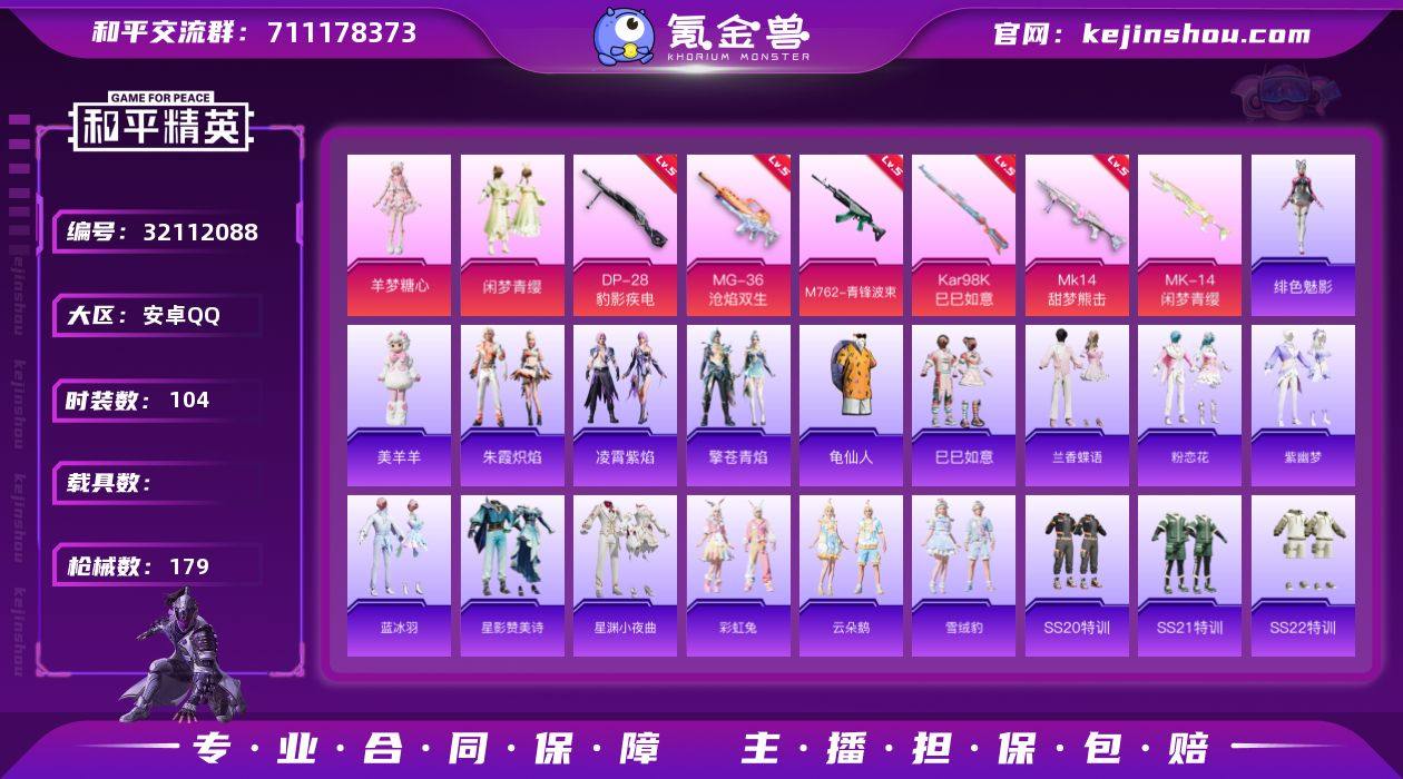 无二次-安卓 手Q-2粉装-6特效枪-0载具-2粉色飞行器-47887热力值-4王牌印记-104套装-179枪皮 【热门品类】:套装-龟仙人 【粉色套装】:粉装-闲梦青缨,角色-羊梦糖心 【粉色枪皮等级】:M762-青锋波束(五级),Kar98K-巳巳如意(五级),Mk14-甜梦熊击(五级),DP-28-豹影疾电(五级),MG-36-沧焰双生(五级) 【粉色枪皮】:M762-青锋波束,Kar98K-巳巳如意,Mk14-闲梦青缨,Mk14-甜梦熊击,DP-28-豹影疾电,MG-36-沧焰双生 【粉色飞行器】:炫彩糖果飞行器,萌物绒绒飞行器 【粉色降落伞】:炎氏战神降落伞,闲梦青缨降落伞,月影灵韵降落伞,星穹咏叹调降落伞,异瞳寒姬降落伞,炫彩糖果降落伞 【稀有套装】:套装-龟仙人,套装-巳巳如意,套装-兰香蝶语,套装-炫彩糖果,套装-粉恋花,套装-紫幽梦,套装-蓝冰羽,套装-星影赞美诗,套装-星渊小夜曲,套装-彩虹兔,套装-云朵鹅,套装-雪绒豹,套装-朱霞炽焰,套装-凌霄紫焰,套装-擎苍青焰,玩偶服-美羊羊,角色-绯色魅影 【稀有枪皮】:AUG-冰晶雪宝,AKM-彩虹符号,AKM-破晓战魂,AKM-龙的传人,M16A4-幻世战舞者,SCAR-L-夜灯,SCAR-L-炫彩节奏,SCAR-L-玉兔迎春,SCAR-L-红色方程式,M416-红色方程式,M416-绯红前夜,M416-蓝色火焰,GROZA-彩虹符号,GROZA-懵萌河马,AUG-天降萌叽,AUG-耀粉歌者,AUG-闲梦青缨,AUG-青春冒险家,QBZ-彩虹符号,QBZ-洛神天依,M762-天降萌叽,M762-彩虹符号,M762-云朵鹅,G36C-懵萌河马,G36C-星穹咏叹调,AC-VAL-天降萌叽,AC-VAL-闲梦青缨,蜜獾-垂柳戏鸭,蜜獾-天降萌叽,蜜獾-娇憨猪猪,ARX-凌霄紫焰,UZI-娇憨猪猪,UZI-影袭,UMP45-夜灯,UMP45-涂山之恋,UMP45-生命誓言,UMP45-蓝色火焰,UMP45-极意拳锋,Vector-彩虹符号,Vector-生命誓言,汤姆逊-天降萌叽,汤姆逊-炫彩节奏,汤姆逊-耀粉歌者,JS9-凌霄紫焰,P90-飞驰...