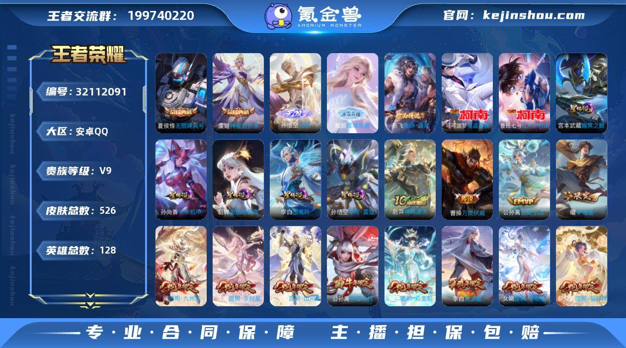 安卓Q-V9-最强王者段位-128英雄-526皮肤-2典藏皮肤-2无双-3珍品传说-52传说-169史诗【英雄全皮】:刘禅全皮,白起全皮,夏侯惇全皮,刘邦全皮,孙权全皮,虞姬全皮,苍全皮,女娲全皮,太乙真人全皮,东皇太一全皮,鬼谷子全皮,黄忠全皮,狂铁全皮,盾山全皮,敖隐全皮,蒙恬全皮,阿古朵全皮,夏洛特全皮,司空震全皮,戈娅全皮,空空儿全皮,影全皮,姬小满全皮,少司缘全皮【荣耀典藏】:夏侯惇无限飓风号,虞姬神鉴启示录【无双皮肤】:孙悟空无相,甄姬雪境奇遇【珍品传说】:张飞兔狲蓬尾,鲁班七号江户川柯南,马可波罗怪盗基德【传说皮肤】:后羿神树通天,曹操万灵伏威,公孙离云诺千山,司空震愿照山河定,女娲愿照千秋盛,妲己愿照众生和,澜愿照九州拓,蔡文姬愿照福禄聚,虞姬愿照岁时盈,云缨幻光神枪,嬴政玄雷天君,王昭君映山客,桑启鸣野蒿,庄周牧神诗旅,夏侯惇霜北刀,墨子黄金天蝎座,典韦战鼓燎原,孙尚香乘龙问璇玑,孙策乘龙淬吴钩,赵云乘龙铭钟鼎,东皇太一灼幽烈阳,夏洛特浮生妄,干将莫邪画中仙,花木兰燃星之曲,虞姬无限倾心,小乔山海琳琅生,吕布怒海麟威,王昭君星穹之声,后羿无尽星芒,女娲补天,孙尚香异界灵契,曜李逍遥 ,李元芳飞鸢探春,公孙离祈雪灵祝,铠绛天战甲,镜炽阳神光,虞姬启明星使,孙悟空零号赤焰,关羽武圣,曜云鹰飞将,李信一念神魔,张良黄金白羊座,干将莫邪久胜战神,虞姬云霓雀翎,达摩黄金狮子座,梦奇胖达荣荣,诸葛亮武陵仙君,貂蝉仲夏夜之梦,李白凤求凰,孙尚香末日机甲,宫本武藏地狱之眼,武则天海洋之心【限定皮肤】:白起狰,夏侯惇霜北刀,暃埋骨钱,蔡文姬夏日便利店,大乔绒语心约,虞姬夏日便利店,姜子牙天穹之誓,杨戬破阵退雄兵,李白谪仙醉月,狄仁杰阴阳师,虞姬凯尔特女王,小乔山海琳琅生,赵云皇家上将,赵云引擎之心,墨...