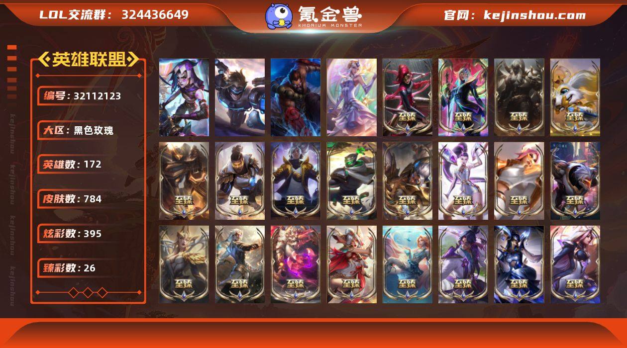 【LOLZ1299】172英雄/784皮肤/3终极/40神话/134限定/26臻彩/395炫彩/75传说/167史诗/未定级账号等级:1026/双城之战2 破碎者 金克丝/10周年 安妮/源代码 乐芙兰/新卧虎藏龙 贾克斯/10周年庆典 凤凰/灰烬骑士 潘森/灰烬骑士 莫德凯撒/水晶掠夺者 卡兹克/灰烬骑士 派克/海克斯 阿利斯塔/海克斯 安妮/海克斯 波比/海克斯 嘉文四世/海克斯 雷克顿/海克斯 魔腾/海克斯 希维尔/至臻 征服者 贾克斯/至臻 真实伤害 亚索/至臻 天龙之子 伊泽瑞尔/至臻 至高天 凯尔/至臻 北极星钢影 卡蜜尔/至臻 斗魂觉醒 派克/至臻 福牛守护者 菲奥娜/至臻 海之歌 萨勒芬妮/至臻 黑夜使者 凯隐/至臻 绝息圣堂 厄运小姐/至臻 K/DA ALL OUT卡莎/至臻 灵魂莲华 易/至臻 魔女 乐芙兰/至臻 青花瓷 丽桑卓/至臻 绒毛菲兹/至臻 神凰行者 烈羽焰凰 霞/至臻 神龙尊者均衡之龙 沃利贝尔/至臻 神龙尊者 炎龙瑟提/至臻 王国机神玄武 盖伦/至臻 未来战士 卢锡安/至臻 腥红之月 亚托克斯/至臻 源计划:阴 劫/爱意绵绵/爱情之歌/觅心游侠卢锡安/银河魔装机神安妮/至臻 黑色玫瑰假面舞会 卡特琳娜/至臻永恒星灵佐伊/至臻北极星神梅尔/天龙之子 卡莎 飞龙乘云/无畏骑士 瑟庄妮 赤子初心/吕布 奉先 炫金战神/张辽 文远 炫金将军/赵云 子龙 炫金将军/墨之影武者 亚索 金墨耀影/征服者 韦鲁斯 炫金/征服者 阿利斯塔 炫金/冠军之隐 劫 凯旋圣装/神龙尊者 圣龙李青 龙腾云起/觅心萝莉 金克丝 是心动啊/玉剑传说 无影 竞星/源计划: 联合 艾希 红莲之弓/战斗学院 卡特琳娜 盛典礼服/黎明使者 锐雯 黑夜使者/星之守护者 金克丝 黑洞/霸天巨兽·雪崩 墨菲特/星之守护者 霞 烈羽/可爱可爱粉红红 布里茨/幻灵战斗队长 厄运小姐 勇气赞歌/魔女 阿卡丽 虚荣/净雪之月 莫甘娜 冬虹/幻灵战斗兔 阿萝拉 梦幻强袭/红莲之刃 锐雯/北极星钢影 卡蜜尔 智慧纽带/心之钢 伊泽瑞尔 天纵...