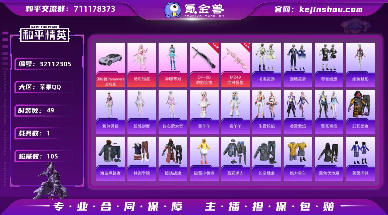 苹果 手Q-2粉装-5特效枪-1载具-3粉色飞行器-26429热力值-3王牌印记-49套装-105枪皮 【粉色套装】:角色-绝对恒星,角色-异瞳寒姬 【粉色枪皮等级】:UMP45-萌骑冒险(四级),AKS-74U-森灵之息(五级),Mk14-福马献瑞(五级),M249-绝对恒星(四级),DP-28-豹影疾电(五级) 【粉色载具】:保时捷Panamera(星辰紫) 【粉色枪皮】:UMP45-萌骑冒险,AKS-74U-森灵之息,Mk14-福马献瑞,M249-绝对恒星,DP-28-豹影疾电 【粉色飞行器】:绝对恒星飞行器,炫彩糖果飞行器,极意拳锋飞行器 【粉色降落伞】:绝对恒星降落伞,星梦奇缘降落伞,灵猫魔法师降落伞,无垠阁降落伞,喜羊羊与灰太狼降落伞,异瞳寒姬降落伞,炫彩糖果降落伞 【稀有套装】:角色-超感刻度,角色-甜心蒙太奇,套装-雪国风尚,套装-炫彩糖果,套装-朱霞炽焰,套装-凌霄紫焰,套装-擎苍青焰,玩偶服-美羊羊,玩偶服-喜羊羊,角色-绯色魅影,角色-紫俏灵猫,套装-书海巡游,套装-画境星梦,套装-琴音绮想,角色-碧青流霞,套装-雨过天青,套装-红釉青花 【稀有枪皮】:AUG-冰晶雪宝,AKM-星之彼岸,AKM-龙的传人,SCAR-L-夜灯,SCAR-L-炫彩节奏,SCAR-L-玉兔迎春,SCAR-L-红色方程式,GROZA-春暖花开,AUG-耀粉歌者,AUG-绝对恒星,M762-天降萌叽,Mk47-虚空骇客,蜜獾-折梦之诗,ACE32-画境星梦,ARX-凌霄紫焰,UZI-啾咪啾咪,UMP45-夜灯,Vector-生命誓言,汤姆逊-像素花束,MP5K-画境星梦,JS9-凌霄紫焰,VSS-彩虹符号,MK20-H-蛇蝎美人,M200-无垠阁,M1加兰德-画境星梦,S1897-春暖花开,S1897-炫彩节奏,S12K-破晓战魂,S12K-夜灯,DBS-荧海星豚,AA12-G-画境星梦,M249-彩虹符号,MG3-幻世战舞者,MG3-第五大道,MG-36-凌霄紫焰,P92-凌霄紫焰,蝎式手枪-蛇蝎美人,爆炸猎弓-喜羊羊与灰太狼,突击盾牌-绝对恒星,平底锅-凌霄紫焰,平底锅-无垠阁,平...