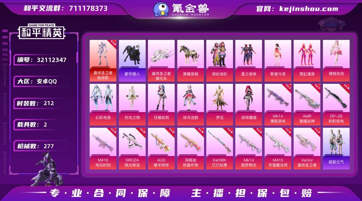 安卓 手Q-1神装-12粉装-14特效枪-2载具-6粉色飞行器-88298热力值-13王牌印记-212套装-277枪皮 【红色神装等级】:最终圣卫者-帕修斯(二级) 【红色角色神装】:最终圣卫者-帕修斯 【热门品类】:粉装-缤纷油彩,套装-都市猎人,套装-龟仙人,套装-暗影哥特 【粉色套装】:粉装-缤纷油彩,粉装-星之彼岸,角色-歌者泠鸢,粉装-霓虹漫游,角色-樱桃泡泡,粉装-幻彩电音,角色-时光之吻,角色-狂魅哈莉,角色-绯月迷踪,角色-罗征,角色-绯穹魔姬 【粉色枪皮等级】:M416-电玩时刻(五级),M416-灵猫魔法师(三级),GROZA-镜光银凌(五级),AUG-暖羊咩咩(五级),ACE32-萌骑漫游(三级),Vector-最终圣卫者(三级),汤姆逊-热量炸弹(五级),AKS-74U-森灵之息(五级),Kar98K-巳巳如意(五级),Mk14-甜梦熊击(五级),Mk14-爆裂游戏(七级),Mk14-福马献瑞(五级),AMR-智耀战神(七级),DP-28-豹影疾电(五级) 【粉色载具】:最终圣卫者摩托车,黑曜夜骑 【粉色枪皮】:M416-电玩时刻,M416-灵猫魔法师,GROZA-镜光银凌,AUG-暖羊咩咩,ACE32-萌骑漫游,Vector-最终圣卫者,汤姆逊-热量炸弹,AKS-74U-森灵之息,Kar98K-巳巳如意,Mk14-甜梦熊击,Mk14-爆裂游戏,Mk14-福马献瑞,AMR-智耀战神,DP-28-豹影疾电 【粉色飞行器】:炫彩糖果飞行器,镜光幻境飞行翼,圣域金龙飞行器,时光之吻飞行器,终晖之翼飞行器,灵猫魔法师飞行器 【粉色降落伞】:绝对恒星降落伞,星夜魔法师降落伞,千面幻镜降落伞,青空秋雨降落伞,炫光之旅降落伞,猪猪侠降落伞,霓虹漫游降落伞,精灵梦叶罗丽降落伞,金丰海韵降落伞,圣域龙灵降落伞,智耀战神降落伞,幻海仙踪降落伞,星穹咏叹调降落伞,时光之吻降落伞,双重狂想降落伞,最终圣卫者降落伞,绯月迷踪降落伞,灵猫魔法师降落伞,绯穹魔姬降落伞,喜羊羊与灰太狼降落伞,异瞳寒姬降落伞,炫彩...