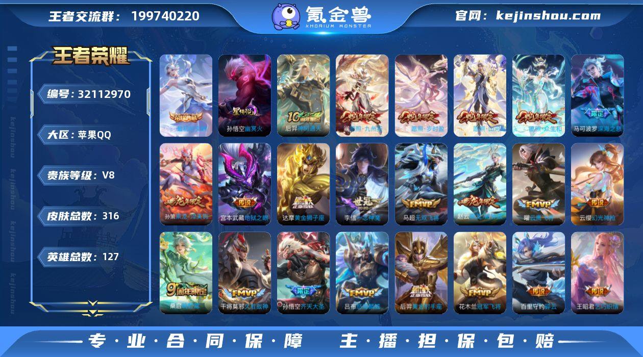【高性价比·最初的交响·幽冥火·愿照山河定·愿照众生和·澜愿照九州拓·愿照岁时盈·策乘龙淬吴钩·碎云·深海之息·无双飞将·一念神魔·可二次】YXw16926-苹果Q-127英雄-316皮肤-9王者印记-250铭文-贵族积分5w【贵族8】【1典藏·1星传说·26传说·7按键】【因赛季更新游戏段付以上号为准!】 【英雄全皮】:猪八戒全皮,鲁班大师全皮 【荣耀典藏】:伽罗最初的交响 【星元皮肤】:孙悟空幽冥火 【传说皮肤】:后羿神树通天,司空震愿照山河定,妲己愿照众生和,澜愿照九州拓,虞姬愿照岁时盈,云缨幻光神枪,桑启鸣野蒿,孙策乘龙淬吴钩,赵云乘龙铭钟鼎,孙悟空齐天大圣,吕布怒海麟威,百里守约碎云,孙尚香音你闪耀,马可波罗深海之息,马超无双飞将,王昭君乞巧织情,虞姬启明星使,曜云鹰飞将,李信一念神魔,张良黄金白羊座,干将莫邪久胜战神,达摩黄金狮子座,花木兰冠军飞将,后羿黄金射手座,宫本武藏地狱之眼,孙悟空地狱火 【限定皮肤】:蔡文姬夏日便利店,虞姬夏日便利店,姜子牙天穹之誓,李白谪仙醉月,狄仁杰阴阳师,赵云皇家上将,赵云引擎之心,孙尚香蔷薇恋人,阿轲迷踪丽影,周瑜赤莲之焰,夏侯惇朔风刀,甄姬游园惊梦,典韦蓝屏警告,马可波罗暗影游猎,马可波罗深海之息,狄仁杰魔术师,狄仁杰万华元夜,达摩沙漠行僧,项羽海滩派对,老夫子醍醐杖,老夫子航海奇遇记,程咬金演武夺筹,刘邦夺宝奇兵,韩信飞衡,王昭君午后时光,兰陵王驯魔猎人,兰陵王金庭之子,孙悟空至尊宝,孙悟空孙行者,孙悟空齐天大圣,牛魔御旌,后羿如梦令,后羿圣弓游侠,李元芳银河之约,李元芳云中旅人,虞姬启明星使,钟馗神迹守卫,钟馗驱傩正仪,干将莫邪冰霜恋舞曲,鬼谷子原初探秘者,鬼谷子五谷丰年,苏烈千军破阵,弈星混沌棋,梦奇顽趣,沈梦溪星空之诺,沈梦溪大漠名商,明世隐疑决卦,裴擒虎李小龙,狂铁电玩高...