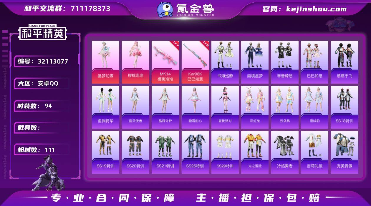 安卓 手Q-2粉装-3特效枪-0载具-0粉色飞行器-32359热力值-6王牌印记-94套装-111枪皮 【粉色套装】:角色-晶梦幻蝶,角色-樱桃泡泡 【粉色枪皮等级】:Kar98K-巳巳如意(五级),Mk14-樱桃泡泡(七级),Mk14-福马献瑞(五级) 【粉色枪皮】:Kar98K-巳巳如意,Mk14-樱桃泡泡,Mk14-福马献瑞 【粉色降落伞】:橘柚倾心降落伞,闲梦青缨降落伞,晶梦幻蝶降落伞,樱桃泡泡降落伞,炫彩糖果降落伞 【稀有套装】:套装-巳巳如意,套装-暖暖麦兜,套装-马上来财,套装-燕燕于飞,套装-鱼渊荷华,套装-晶灵使者,套装-晶辉守护,角色-糖霜甜心,角色-蜜桃派对,套装-彩虹兔,套装-云朵鹅,套装-雪绒豹,套装-书海巡游,套装-画境星梦,套装-琴音绮想,套装-雨过天青,套装-红釉青花 【稀有枪皮】:AKM-彩虹符号,AKM-灼热熔岩,AKM-破晓战魂,AKM-龙的传人,SCAR-L-炫彩节奏,SCAR-L-玉兔迎春,M416-糯团青竹,M416-红色方程式,M416-蓝色火焰,GROZA-晶梦幻蝶,AUG-耀粉歌者,AUG-闲梦青缨,QBZ-彩虹符号,QBZ-飞驰魅影,M762-天降萌叽,M762-云朵鹅,AC-VAL-天降萌叽,AC-VAL-闲梦青缨,ACE32-画境星梦,UMP45-生命誓言,UMP45-蓝色火焰,Vector-百合蜜语,汤姆逊-天降萌叽,汤姆逊-炫彩节奏,汤姆逊-耀粉歌者,汤姆逊-樱桃泡泡,MP5K-画境星梦,P90-飞驰魅影,P90-巳巳如意,Kar98K-彩虹符号,Kar98K-飞驰魅影,Kar98K-星穹咏叹调,M24-炫彩节奏,M24-樱桃泡泡,Mini14-耀粉歌者,Win94-晶梦幻蝶,SLR-甜蜜草莓,M417-惊鸿侠骨,MK20-H-樱桃泡泡,M200-惊鸿侠骨,SVD-云朵鹅,M1加兰德-画境星梦,S1897-炫彩节奏,S1897-飞驰魅影,S12K-玩趣呆呆,S12K-幻世战舞者,DBS-彩虹符号,DBS-荧海星豚,AA12-G-画境星梦,SPAS-12-云朵鹅,M249-彩虹符号,DP-28-彩虹符号,MG3-幻世战舞者,MG3-惊鸿侠骨,沙漠之鹰-云朵鹅,爆炸猎弓-...