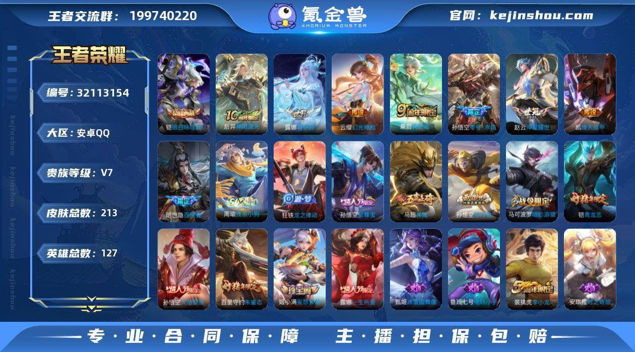 【AZW146】安卓Q-V7-永恒钻石IV段位-127英雄-213皮肤-1典藏皮肤-7传说-55史诗 【英雄全皮】:敖隐全皮 【荣耀典藏】:铠银白咏叹调 【传说皮肤】:后羿神树通天,云缨幻光神枪,桑启鸣野蒿,露娜霜月吟,赵云淬星耀世,铠绛天战甲,孙悟空零号赤焰 【限定皮肤】:姜子牙天穹之誓,狄仁杰阴阳师,赵云皇家上将,赵云百木心枪,嬴政白昼王子,庄周高山流水,高渐离玩趣恶龙,钟无艳王者之锤,吕布猎兽之王,夏侯惇朔风刀,曹操烛龙,典韦穷奇,马可波罗暗影游猎,狄仁杰魔术师,狄仁杰万华元夜,达摩星际陆战队,达摩沙漠行僧,项羽海滩派对,老夫子醍醐杖,程咬金演武夺筹,露娜一生所爱,兰陵王金庭之子,孙悟空至尊宝,孙悟空大圣娶亲,孙悟空零号赤焰,孙悟空孙行者,牛魔御旌,后羿圣弓游侠,李元芳云中旅人,钟馗驱傩正仪,干将莫邪真爱魔法,鬼谷子原初探秘者,鬼谷子五谷丰年,铠青龙志,苏烈千军破阵,百里守约朱雀志,弈星混沌棋,沈梦溪大漠名商,明世隐疑决卦,裴擒虎李小龙,狂铁御狮,米莱狄御霄,米莱狄胡桃异想国,云中君纤云弄巧,盾山御銮,猪八戒西部大镖客,上官婉儿梁祝,嫦娥拒霜思,艾琳女武神,张良古海寻踪,鬼谷子天穹祈灯,姬小满妄想食味,鲁班七号蔬乡物语,李元芳蔬乡物语,刘邦剑破天穹 【年限皮肤】:百里守约朱雀志,铠青龙志 【赛季限定】:曹操烛龙,典韦穷奇,狂铁御狮,米莱狄御霄,牛魔御旌,盾山御銮,夏侯惇朔风刀,弈星混沌棋,明世隐疑决卦,老夫子醍醐杖,鬼谷子原初探秘者,狄仁杰万华元夜,程咬金演武夺筹,钟馗驱傩正仪,苏烈千军破阵,达摩沙漠行僧,兰陵王金庭之子,沈梦溪大漠名商,李元芳云中旅人,张良古海寻踪,鬼谷子天穹祈灯,刘邦剑破天穹,姜子牙天穹之誓,东皇太一噬灭天穹,太乙真人谧流熔炉,钟馗虚灵犬护,甄姬逆浪荇歌,牛魔星界战将 【战令限定】:...