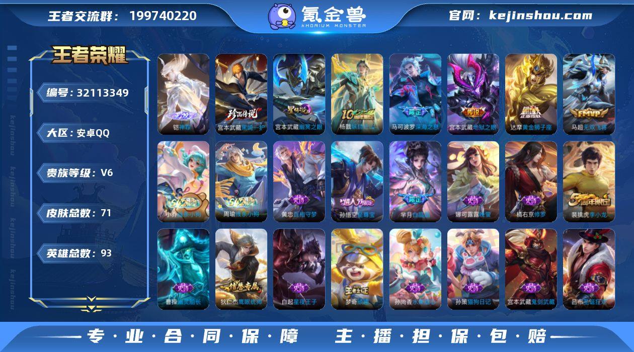 【精品战力号推荐·金标万战赵怀真·万战宫本武藏·万战铠·铠神罪·黑崎一护·幽冥之眼·深海之息·无双飞将·至尊宝·可二次】YXw15662-安卓Q-93英雄-69皮肤-3王者印记-90铭文-贵族积分1w【贵族6】【1无双·1珍品·1星传说·5传说·5按键】【因赛季更新游戏段付以上号为准!】 【英雄全皮】:影全皮 【无双皮肤】:铠神罪 【珍品传说】:宫本武藏黑崎一护 【星元皮肤】:宫本武藏幽冥之眼 【传说皮肤】:杨戬纵目迁山,马可波罗深海之息,马超无双飞将,达摩黄金狮子座,宫本武藏地狱之眼 【限定皮肤】:狄仁杰阴阳师,赵云皇家上将,芈月白晶晶,马可波罗深海之息,狄仁杰魔术师,项羽海滩派对,孙悟空至尊宝,梦奇顽趣,裴擒虎李小龙,沈梦溪龙舞盛年 【赛季限定】:钟馗虚灵犬护,甄姬逆浪荇歌,亚瑟荣光之誓,梦奇顽趣 【战令限定】:周瑜线条小狗,小乔线条小狗 【史诗皮肤】:赵云皇家上将,貂蝉圣诞恋歌,狄仁杰魔术师,宫本武藏鬼剑武藏,孙尚香水果甜心,妲己魅力维加斯,吕布圣诞狂欢,曹操幽灵船长,张飞乱世虎臣,孙悟空至尊宝,李元芳逐浪之夏,白起星夜王子,狄仁杰鹰眼统帅,娜可露露晚萤,橘右京修罗,裴擒虎李小龙,芈月白晶晶,梦奇顽趣,黄忠百相守梦,小乔线条小狗,周瑜线条小狗 【其他皮肤】:项羽海滩派对,韩信教廷特使,赵云忍炎影,安琪拉玩偶对对碰,亚瑟死亡骑士,达摩拳王,宫本武藏万象初新,狄仁杰阴阳师,刘备汉昭烈帝,孙尚香沉稳之力,诸葛亮掌控之力,典韦铁甲之心,猪八戒潮玩探月行,赵怀真太极少年,莱西奥西部游侠,廉颇功夫炙烤,沈梦溪龙舞盛年,影魅影绮裳,钟馗虚灵犬护,白起死霸装,甄姬逆浪荇歌,庄周锦麟游梦,莱西奥踏浪烽翎,鬼谷子克喵,哪吒罗小黑战记,亚瑟荣光之誓,艾琳鹤鸣心笺,虞姬溯影追猎,曹操超能战警,雅典娜战争女神,东皇太一东海龙王,百里守约绝影神枪,百...