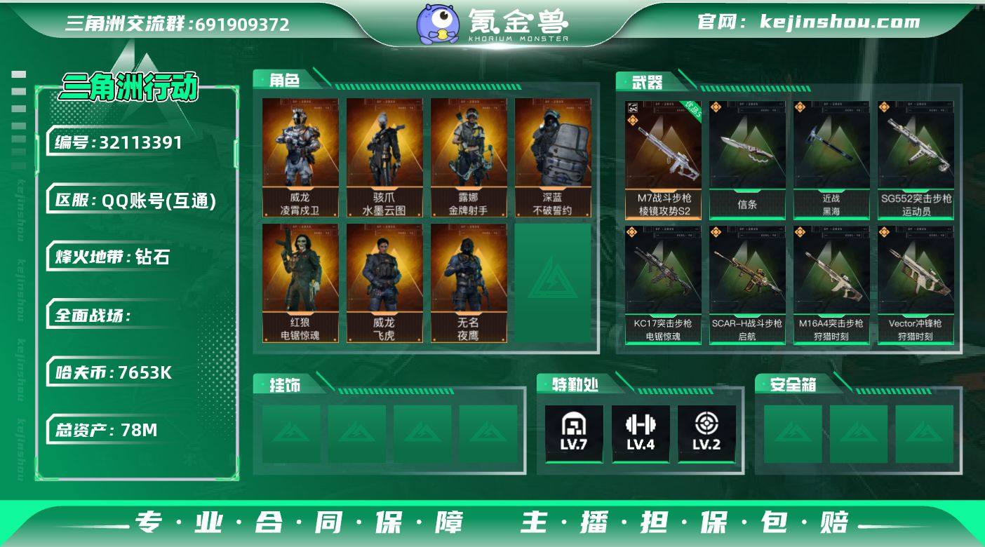 "YXB-7653k哈伏币-总资产78m流动资产62m-60烽火等级-钻石-23战场等级-列兵 部门11211特勤处仓库7训练中心4靶场2 【干员外观】:骇爪-水墨云图,威龙-凌霄戍卫,威龙-飞虎,无名-夜鹰,深蓝-不破誓约,红狼-电锯惊魂,露娜-金牌射手,乌鲁鲁-荒原猎手 【近战皮肤】:近战-信条,近战-黑海,近战-黑鹰 【典藏外观】:M7战斗步枪-棱镜攻势S2优品S 【传说外观】:AKM突击步枪-秘银工艺,M16A4突击步枪-狩猎时刻,SG552突击步枪-运动员,AK-12突击步枪-夜鹰,SCAR-H战斗步枪-水墨云图,SCAR-H战斗步枪-启航,G3战斗步枪-狩猎时刻,KC17突击步枪-电锯惊魂,Vector冲锋枪-狩猎时刻,SMG-45冲锋枪-骑士,勇士冲锋枪-能天使-午夜邮差,725双管霰弹枪-送葬人-无题密令,M250通用机枪-骑士之心,M14射手步枪-蛮荒,R93狙击步枪-维什戴尔,G18-飞虎,复合弓-黑·天际线 【挂饰】:挂饰-王国利刃,挂饰-阿萨拉盾兵,挂饰-阿萨拉机枪兵,挂饰-赤霄游龙,挂饰-维什戴尔,挂饰-黑,挂饰-诡影喷火兵,挂饰-崩岩重炮,挂饰-福禄,挂饰-聚宝盆,挂饰-狩猎时刻,挂饰-晶石幻想,挂饰-小羊,挂饰-启程,挂饰-雪人,挂饰-猎杀本能,挂饰-卡皮巴拉,挂饰-起舞的女郎,挂饰-紧急撤离,挂饰-麻将 "
