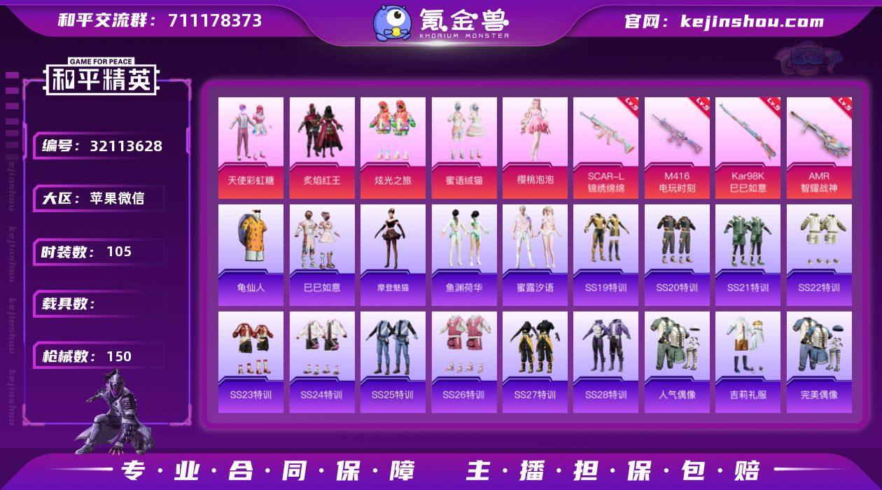 【AZH2987】苹果 微信【天使彩虹糖 樱桃泡泡 蜜语绒猫】5粉装-6特效枪-0载具-3粉色飞行器-43851热力值-4王牌印记-105套装-150枪皮 【热门品类】:套装-龟仙人 【粉色套装】:粉装-天使彩虹糖,粉装-炙焰红王,粉装-炫光之旅,粉装-蜜语绒猫,角色-樱桃泡泡 【粉色枪皮等级】:SCAR-L-锦绣绵绵(五级),M416-电玩时刻(五级),Kar98K-巳巳如意(五级),Mk14-福马献瑞(五级),AMR-智耀战神(五级),PKM-萌骑夺宝(二级) 【粉色枪皮】:SCAR-L-锦绣绵绵,M416-电玩时刻,Kar98K-巳巳如意,Mk14-福马献瑞,AMR-智耀战神,PKM-萌骑夺宝 【粉色飞行器】:拂晓神骑飞行器,镜光幻境飞行翼 【粉色降落伞】:齐天大圣降落伞,星夜魔法师降落伞,彩虹甜喵降落伞,第五大道降落伞,夜幕颂歌降落伞,繁龙极客降落伞,蜜语绒猫降落伞,江南烟雨降落伞,精灵梦叶罗丽降落伞,金丰海韵降落伞,鬼刀降落伞,霁蓝缠春降落伞 【稀有套装】:套装-龟仙人,套装-巳巳如意,套装-马上来财,角色-摩登魅猫,套装-鱼渊荷华,套装-蜜露汐语,套装-雨过天青,套装-红釉青花,角色-幽雨猫猫,角色-暖阳柴柴 【稀有枪皮】:AKM-破晓战魂,AKM-龙的传人,M16A4-幻世战舞者,SCAR-L-炫彩节奏,SCAR-L-玉兔迎春,M416-糯团青竹,M416-红色方程式,M416-绯红前夜,M416-蓝色火焰,GROZA-2B战斗服款,GROZA-田园牧歌,AUG-天降萌叽,AUG-耀粉歌者,AUG-闲梦青缨,QBZ-彩虹符号,M762-天降萌叽,M762-彩虹符号,M762-绯红前夜,Mk47-洛神天依,AC-VAL-天降萌叽,AC-VAL-快闪甜心,蜜獾-天降萌叽,蜜獾-娇憨猪猪,Famas-镜域双华,ARX-天马神君,UZI-啾咪啾咪,UZI-天降萌叽,UZI-娇憨猪猪,UZI-红色方程式,UMP45-夜灯,UMP45-生命誓言,Vector-焰鹰斗篷,Vector-彩虹符号,Vector-生命誓言,Vector-田园牧歌,汤姆逊-天降萌叽,汤姆逊-耀粉歌者,野牛-粉...