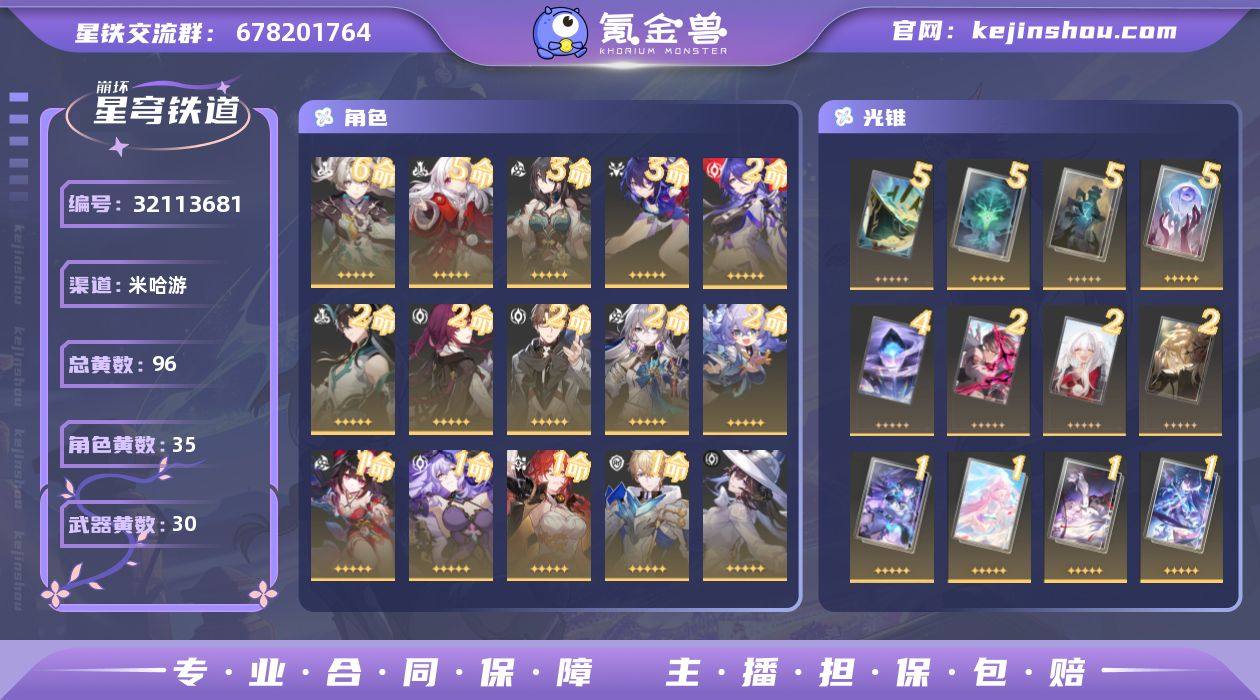 总黄数:96 五星光锥数:30 五星角色数:35 开拓等级:70 开拓者性别:女 星轨专票:0 梦华数量:0 星琼数量:1971 6命流萤,5命克拉拉,3命阮·梅,3命希儿,2命黄泉,2命丹恒·饮月,2命卡芙卡,2命瓦尔特,2命布洛妮娅,2命白露,1命花火,1命黑天鹅,1命姬子,1命杰帕德,0命大丽花,0命昔涟,0命丹恒·腾荒,0命长夜月,0命刻律德菈,0命海瑟音,0命Archer,0命风堇,0命遐蝶,0命缇宝,0命大黑塔,0命忘归人,0命灵砂,0命椒丘,0命真理医生,0命藿藿,0命符玄,0命刃,0命银狼,0命景元,0命彦卿 5精不息的演算,5精孤独的疗愈,5精记忆永不落幕,5精星海巡航,4精记忆的质料,2精以世界之名,2精无可取代的东西,2精如泥酣眠,1精勿忘她的火焰,1精爱如此刻永恒,1精致长夜的星光,1精海洋为何而歌,1精理想燃烧的地狱,1精愿虹光永驻天空,1精让告别,更美一些,1精如果时间是一朵花,1精向着不可追问处,1精长路终有归途,1精唯有香如故,1精梦应归于何处,1精行于流逝的岸,1精游戏尘寰,1精镜中故我,1精她已闭上双眼,1精比阳光更明亮的,1精只需等待,1精于夜色中,1精但战斗还未结束,1精时节不居,1精记一位星神的陨落 换绑材料:可提供换绑材料 邮箱状态:未绑定 psn绑定情况:否 taptap绑定情况:否 卖家说:三队全