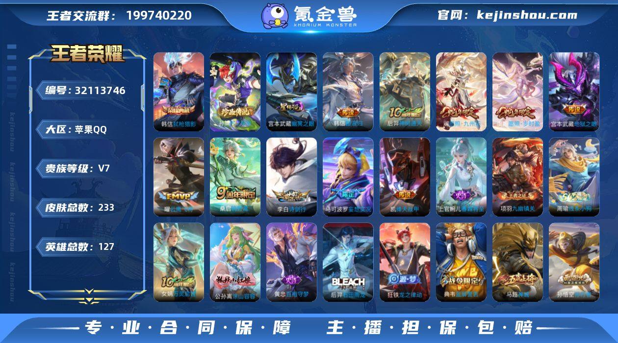 W15026,,可立即换绑无需挂单养号,,铭文满级,,传说10,,星传说1,,,按键13,,,夺宝147,,,苹果Q-V7-至尊星耀IV段位-127英雄-233皮肤-1典藏皮肤-1珍品传说-10传说-72史诗 【英雄全皮】:孙权全皮,敖隐全皮 【荣耀典藏】:韩信弑枪猎影 【珍品传说】:孙策时之奇旅 【传说皮肤】:韩信踏浪归,后羿神树通天,澜愿照九州拓,虞姬愿照岁时盈,桑启鸣野蒿,马可波罗妄想实况,李白诗剑行,铠绛天战甲,曜云鹰飞将,宫本武藏地狱之眼 【限定皮肤】:蔡文姬夏日便利店,虞姬夏日便利店,姜子牙天穹之誓,杨戬破阵退雄兵,李白谪仙醉月,狄仁杰阴阳师,廉颇寅虎御盾,赵云皇家上将,高渐离玩趣恶龙,白起夜都怪侠,元歌无心,典韦蓝屏警告,马可波罗暗影游猎,马可波罗妄想实况,狄仁杰魔术师,达摩沙漠行僧,项羽海滩派对,兰陵王驯魔猎人,兰陵王金庭之子,孙悟空孙行者,李元芳银河之约,李元芳匿光侦查者,李元芳云中旅人,干将莫邪胡桃夹子,鬼谷子五谷丰年,苏烈千军破阵,梦奇顽趣,沈梦溪大漠名商,裴擒虎擒涛扼浪,云中君纤云弄巧,上官婉儿梁祝,嫦娥拒霜思,西施玲珑珍味,鲁班大师探海日志,桑启海盐诗旅,戈娅驭风魔法,赵怀真鹤归松栖,阿古朵江河有灵,张良古海寻踪,蒙犽百解令,鬼谷子天穹祈灯,沈梦溪龙舞盛年,鲁班七号蔬乡物语,李元芳蔬乡物语,刘邦剑破天穹,程咬金群星魔术团,芈月浮光幕影,周瑜熔金海岸 【年限皮肤】:廉颇寅虎御盾,澜愿照九州拓,虞姬愿照岁时盈 【赛季限定】:苏烈千军破阵,达摩沙漠行僧,兰陵王金庭之子,沈梦溪大漠名商,李元芳云中旅人,桑启海盐诗旅,裴擒虎擒涛扼浪,鲁班大师探海日志,张良古海寻踪,鬼谷子天穹祈灯,刘邦剑破天穹,姜子牙天穹之誓,东皇太一噬灭天穹,太乙真人谧流熔炉,钟馗虚灵犬护,甄姬逆浪荇歌,亚瑟荣光之誓,梦奇顽趣,项羽九幽...