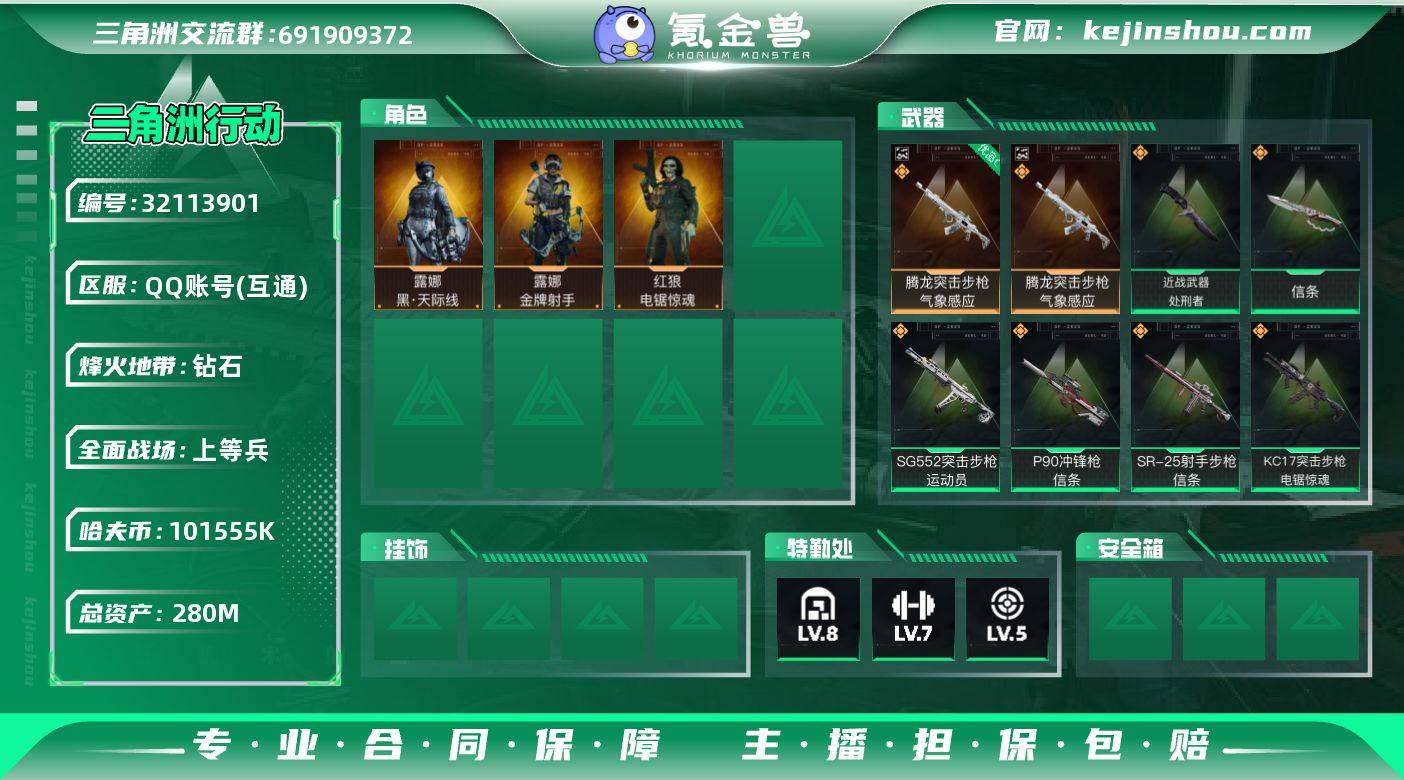 【热门皮肤号:单红+双刀+单典藏/高额资产280M】【黑天际线+信条+处刑者+腾龙气象感应优品c】【Q区三端互通】【无二次】YXz7914-特勤处:仓库8级/靶场5级/训练中心7级-总资产280.6m-哈夫币101m-烽火等级:60级 【干员外观】:露娜-黑·天际线,红狼-电锯惊魂,露娜-金牌射手 【近战皮肤】:近战-信条,近战-处刑者,近战-黑鹰 【典藏外观】:腾龙突击步枪-气象感应 【典藏外观成色】:腾龙突击步枪-气象感应(优品C) 【传说外观】:M4A1突击步枪-阿米娅,SG552突击步枪-运动员,AK-12突击步枪-特斯拉线圈,SCAR-H战斗步枪-启航,G3战斗步枪-骑士,CAR-15突击步枪-阿米娅,腾龙突击步枪-捞点薯条,KC17突击步枪-电锯惊魂,P90冲锋枪-信条,UZI冲锋枪-特斯拉线圈,SR-3M紧凑突击步枪-特斯拉线圈,勇士冲锋枪-能天使-午夜邮差,M250通用机枪-骑士之心,M14射手步枪-电锯惊魂,SR-25射手步枪-信条,AWM狙击步枪-捞点薯条,93R-捞点薯条,复合弓-黑·天际线 【史诗外观】:ASh-12战斗步枪-无极限,K416突击步枪-冬日风情,M16A4突击步枪-竞赛选手,AUG突击步枪-蝮蛇,M7战斗步枪-百步穿杨,SCAR-H战斗步枪-囚徒,G3战斗步枪-流沙送葬,AS Val突击步枪-百步穿杨,K437突击步枪-守护者,MP5冲锋枪-深海恐惧,MP5冲锋枪-战术竞备,MP5冲锋枪-竞技风,Vector冲锋枪-猎鳄行动,Vector冲锋枪-百步穿杨,Vector冲锋枪-异域战争,SR-3M紧凑突击步枪-战术竞备,勇士冲锋枪-工业狂潮,MP7冲锋枪-守护者,S12K霰弹枪-曙光,PKM通用机枪-蝮蛇,QJB201轻机枪-炽焰,Mini-14射手步枪-守护者,SVD狙击步枪-阿萨拉工艺,SV-98狙击步枪-林中猎手,SV-98狙击步枪-囚徒,M700狙击步枪-百步穿杨,AWM狙击步枪-无极限,AWM狙击步枪-流沙送葬,复合弓-守护者 【稀有外观】:SV-98狙击步枪-海岸线,QJB201轻机枪-千里骏骨,M4A1突击步枪-繁盛,AKM...