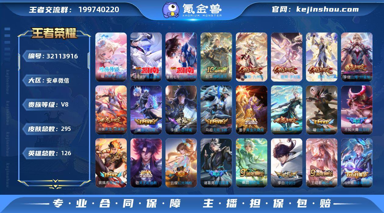 【精品v8推荐·怪盗基德·江户川柯南·瑶大耳狗之梦·愿照山河定·冥王哈迪斯·祥瑞亨通·乘龙淬吴钩·鹤羽星尊·山海炽霜斩·诗剑行·绯月行·可二次】YXw15472-安卓WX-126英雄-295皮肤-13王者印记-180铭文-贵族积分7w【贵族8】【3珍品·1星传说·27传说·15按键·249幸运值】【因赛季更新游戏段付以上号为准!】 【英雄全皮】:司空震全皮,金蝉全皮,影全皮 【珍品传说】:马可波罗怪盗基德,鲁班七号江户川柯南,瑶大耳狗之梦 【星元皮肤】:刘备时之思念 【传说皮肤】:后羿神树通天,司空震愿照山河定,澜愿照九州拓,虞姬愿照岁时盈,云缨幻光神枪,裴擒虎祥瑞亨通,王昭君映山客,桑启鸣野蒿,庄周牧神诗旅,铠冥王哈迪斯,云中君群星魔术团,墨子黄金天蝎座,孙策乘龙淬吴钩,赵云乘龙铭钟鼎,澜逐花归海,诸葛亮鹤羽星尊,张飞百相守梦,项羽无限倾心,李信山海炽霜斩,李白诗剑行,不知火舞绯月行,马超无双飞将,虞姬启明星使,曜云鹰飞将,李信一念神魔,刘备时之恋人,貂蝉猫影幻舞 【限定皮肤】:铠冥王哈迪斯,姜子牙天穹之誓,李白谪仙醉月,狄仁杰阴阳师,赵云皇家上将,庄周云端筑梦师,钟无艳超时空战士,扁鹊奇幻香踪,白起夜都怪侠,元歌无心,甄姬落雪兰心,狄仁杰魔术师,狄仁杰万华元夜,项羽海滩派对,项羽无限倾心,老夫子醍醐杖,关羽百相守梦,王昭君午后时光,兰陵王金庭之子,不知火舞绯月行,刘备百相守梦,张飞百相守梦,李元芳云中旅人,虞姬启明星使,杨戬潮玩骑兵,干将莫邪胡桃夹子,雅典娜单词大作战,雅典娜黎明之约,蔡文姬繁星吟游,鬼谷子原初探秘者,鬼谷子五谷丰年,诸葛亮鹤羽星尊,梦奇顽趣,沈梦溪大漠名商,沈梦溪匿光破解者,明世隐疑决卦,裴擒虎天狼狩猎者,裴擒虎李小龙,裴擒虎擒涛扼浪,狂铁电玩高手,云中君纤云弄巧,李信山海炽霜斩,上官婉儿神器万象笔,嫦娥暖冬兔眠,...