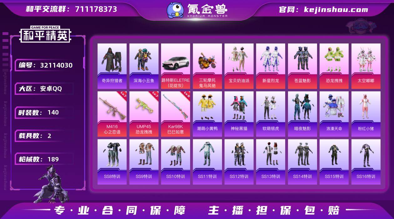 安卓 手Q-5粉装-4特效枪-2载具-0粉色飞行器-60211热力值-8王牌印记-140套装-189枪皮 【热门品类】:套装-浪漫天命,套装-深海小丑鱼,套装-奇异狩猎者,套装-潮萌小黄鸭,套装-粉红小猪 【粉色套装】:粉装-宝贝奶油派,粉装-新星烈龙,粉装-苍蓝魅影,粉装-恐龙拽拽,粉装-太空嘟嘟 【粉色枪皮等级】:M416-心之恋语(七级),UMP45-恐龙拽拽(七级),Kar98K-巳巳如意(五级),PKM-萌骑夺宝(五级) 【粉色载具】:路特斯ELETRE(花绽灰),鬼马风驰 【粉色枪皮】:M416-心之恋语,UMP45-恐龙拽拽,Kar98K-巳巳如意,PKM-萌骑夺宝 【粉色降落伞】:粉色回忆降落伞,甜心宝贝降落伞,繁花小夜曲降落伞,香水柠檬降落伞,恐龙拽拽降落伞,橘柚倾心降落伞,彩虹甜喵降落伞,闲梦青缨降落伞 【稀有枪皮】:AKM-夜灯,AKM-彩虹符号,AKM-恐龙拽拽,AKM-玉龙,AKM-生命誓言,AKM-缤纷海域,AKM-萌趣颜团子,AKM-虎虎生威,AKM-龙的传人,M16A4-幻世战舞者,M16A4-机械英豪,M16A4-甜心亚梦,SCAR-L-暗夜玫瑰,SCAR-L-炫彩节奏,SCAR-L-玉兔迎春,SCAR-L-碧影闪光,SCAR-L-红色方程式,M416-夜灯,M416-红色方程式,GROZA-异彩先驱,GROZA-彩虹符号,GROZA-恐龙拽拽,GROZA-治愈之星,AUG-天降萌叽,AUG-幻影战神,AUG-耀粉歌者,AUG-青春冒险家,QBZ-原初圣火,QBZ-彩虹符号,QBZ-神秘黑猫,QBZ-飞驰魅影,M762-天降萌叽,M762-橘柚倾心,M762-深海曼妙,M762-牛气冲天,M762-瑞龙福将,M762-甜心宝贝,M762-绯红前夜,M762-镭射皇者,Mk47-炫光之旅,Mk47-粉色回忆,Mk47-青春冒险家,G36C-不夜海上花,G36C-时空追击者,AC-VAL-天降萌叽,AC-VAL-甜心亚梦,蜜獾-娇憨猪猪,UZI-众神之王,UZI-天降萌叽,UZI-娇憨猪猪,UZI-炫彩节奏,UMP45-时空追击者,UMP45-生命誓言,UMP45-粉色回忆,Vector-焰鹰斗篷,Vector-彩虹符号,...