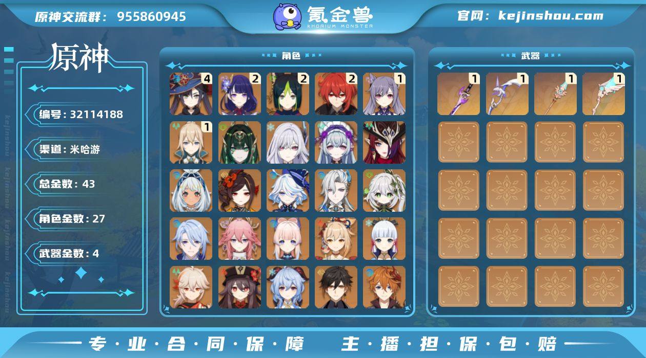 邮箱: 不送邮/死邮 总黄数: 43 冒险等级: 59 4命金色角色: 四命莫娜 2命金色角色: 二命迪卢克,二命雷电将军,二命提纳里 1命金色角色: 一命刻晴,一命琴 0命金色角色: 温迪,枫原万叶,神里绫华,宵宫,七七,达达利亚,钟离,甘雨,胡桃,珊瑚宫心海,八重神子,神里绫人,纳西妲,那维莱特,芙宁娜,千织,玛拉妮,恰斯卡,梦见月瑞希,丝柯克,奈芙尔 拥有武器: 天空之翼,雾切之回光,阿莫斯之弓,天空之脊 1精武器: 天空之翼,雾切之回光,阿莫斯之弓,天空之脊