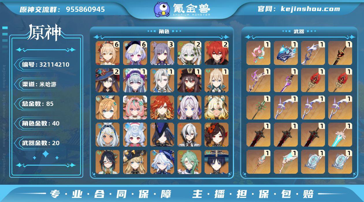 冒险等级:60 总黄数:85 5星角色数:40 5星武器数:20 原石数量:68 相遇之缘数量:0 纠缠之源数量:0 6命宵宫,6命七七,3命刻晴,2命纳西妲,2命迪卢克,2命莫娜,1命梦见月瑞希,1命那维莱特,1命胡桃,1命琴,0命爱可菲,0命瓦雷莎,0命玛薇卡,0命茜特菈莉,0命希诺宁,0命玛拉妮,0命希格雯,0命克洛琳德,0命阿蕾奇诺,0命千织,0命闲云,0命娜维娅,0命芙宁娜,0命白术,0命流浪者,0命妮露,0命夜兰,0命魈,0命申鹤,0命荒泷一斗,0命珊瑚宫心海,0命雷电将军,0命神里绫华,0命枫原万叶,0命甘雨,0命钟离,0命达达利亚,0命可莉,0命温迪,0命提纳里 6命班尼特,6命嘉明,6命久岐忍,6命卡齐娜,6命绮良良,6命香菱,6命行秋,6命夏沃蕾,6命芭芭拉,6命北斗,6命重云,6命迪奥娜,6命珐露珊,6命菲谢尔,6命九条裟罗,6命坎蒂丝,6命柯莱,6命雷泽,6命罗莎莉亚,6命诺艾尔,6命凝光,6命砂糖,6命托马,6命五郎,6命辛焱,6命烟绯,6命瑶瑶,6命云堇,6命早柚,5命夏洛蒂,5命卡维,5命莱依拉,5命鹿野院平藏,5命米卡,4命赛索斯,3命塔利雅,3命多莉,2命琳妮特,2命凯亚,1命爱诺,1命伊安珊,1命伊法,0命雅珂达,0命菲米尼,0命蓝砚,0命欧洛伦,0命安柏,0命丽莎,0命埃洛伊 精1溢彩心念,精1万世流涌大典,精1若水,精1赤角石溃杵,精1飞雷之弦振,精1雾切之回光,精1护摩之杖,精1和璞鸢,精1阿莫斯之弓,精1狼的末路,精1天空之傲,精1天空之脊,精1天空之翼,精1四风原典 100%侦察骑士,古恩希尔德的传承,帆影游风,花时来信,极夜真梦,冷花幽露,霓裾翩跹,倩影游侠,莎邦之息,岁夜欢哗,纱中幽兰,玄玉瑶芳,星与月之约,雨化竹身,叶隐芳名,致教会自由人