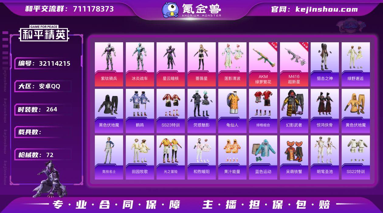 实名:可二次实名 是否支持人脸包赔:不支持 粉装数量:5 特效枪数量:2 时装数:264 枪械数:72 冰炎战车,莲影清波,蔷薇星,星云暗核,紫钛骑兵 五级AKM-绿萝繁花,三级M416-超新星 狙击之神,绿野邂逅,冰冻风暴,滨海厨神,白兰地假日,春光漫游,晨曦薄雾,彩霞狙击,呆萌铁蟹,风暴特警,绯格组合,飞行日记,龟仙人,光之冒险,幻彩翩翩,鹤鸣,黑色伏地魔,黄色伏地魔,和煦暖阳,幻影武者,惊鸿侠骨,竞技名士,锦衣飞扬,空岛之星,快闪甜心,龙的传人,蓝色运动,龙腾端午,妙红点点,梦幻奶油,萌黄之夏,魅力单车,果汁能量,懵萌河马,明鸳圣池,霓虹街区,柠萌假日,轻风白浪,青涩时光,清新柠檬,神气柴柴,SS21特训,SS22特训,SS23特训,SS24特训,SS25特训,SS26特训,涂山之恋,特训学院,田园牧歌,完美偶像,星谷精灵,星际旅行,血色贵族,雪山征服者,荧惑魅影,野性战心,鹰眼刺客,耀眼新星,战地督导,忠真马岱 彩装战姬降落伞,古战神甲降落伞,莲影清波降落伞,熔岩统帅降落伞,甜心宝贝降落伞,万古烈焰降落伞,音爆索尼克降落伞,仲夏莫吉托降落伞 卖家说:QQ永久社交游戏无任何影响
