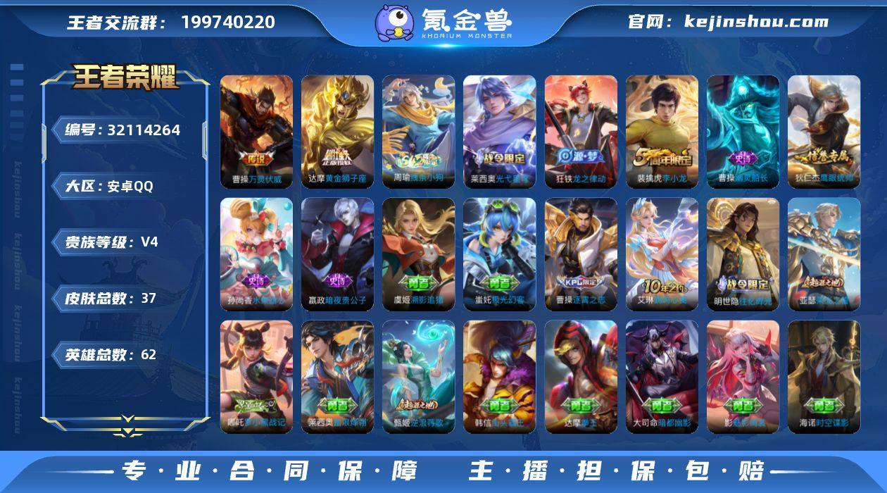 【社交限制特价出售】【秒换绑】安卓Q-V4-【1.2w小国标曹操,蒙恬,影】至尊星耀I段位-62英雄-37皮肤-2传说-7史诗 【英雄全皮】:影全皮 【传说皮肤】:曹操万灵伏威,达摩黄金狮子座 【限定皮肤】:狄仁杰阴阳师,项羽海滩派对,裴擒虎李小龙 【史诗皮肤】:孙尚香水果甜心,嬴政暗夜贵公子,曹操幽灵船长,狄仁杰鹰眼统帅,裴擒虎李小龙,狂铁龙之律动,莱西奥光弋星穹,周瑜线条小狗 【其他皮肤】:项羽海滩派对,韩信街头霸王,安琪拉玩偶对对碰,达摩拳王,狄仁杰阴阳师,关羽龙腾万里,刘禅唤灵魔甲,戈娅危途狂花,海诺时空谍影,大司命暗都幽影,影魅影绮裳,甄姬逆浪荇歌,莱西奥踏浪烽翎,哪吒罗小黑战记,亚瑟荣光之誓,明世隐往忆晖光,艾琳鹤鸣心笺,曹操逐霄之志,蚩奼极光幻客,虞姬溯影追猎,鲁班七号福禄兄弟,曹操超能战警,关羽天启骑士,元歌午夜歌剧院,李信灼热之刃,马超幸存者,蒙恬秩序猎龙将 【营地ID】:1551927785 【小国标】:小国标曹操,小国标蒙恬,小国标影