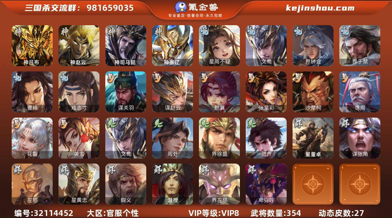【2377】官阶:大将军;VIP等级:VIP8;史诗武将数量:33;动态皮肤数量:27;武将总数:354;史诗宝珠数量:0;将魂数量:2481;神将:6;魏国史诗武将:20;蜀国史诗武将:8;吴国史诗武将:3;群史诗武将:8 神吕布,神赵云,神司马懿,神张辽,神吕蒙,神周瑜,星周不疑,文鸯,魏-司马昭,界钟会,界于禁,曹纯,戏志才,关索,谋赵云,赵襄,张星彩,沙摩柯,谯周,花鬘,谋关羽,周处,界徐盛,贺齐,左慈,星黄忠,麹义,沮授,界左慈,卑弥呼,谋张角,星董卓,神鲁肃-九州为局,神太史慈-勇撼日月(动态),神司马懿-鉴往知来(动态),星周不疑-才广志宏(动态),曹丕-气荡山河(动态),甄姬-明珠耀躯(动态),SP蔡文姬-兔年冬日(动态),钟会-谋谟之勋(动态),界钟会-谋谟之勋(动态),戏志才-举棋若定(动态),曹纯-虎年春节(动态),司马昭-昭威淮南(动态),星徐晃-斧引霹雳(动态),诸葛亮-龙年限定(动态),马超-牛年春节(动态),张飞-据水断桥(动态),黄月英-鼠年春节(动态),界张飞-据水断桥(动态),界马超-牛年春节(动态),界黄月英-鼠年春节(动态),关银屏-兔年春节(动态),关索-虎年七夕(动态),诸葛果-蛇年限定(动态),周处-义除三害(动态),孙权-永开吴祚(动态),文鸯-势若万钧(动态),袁绍-声震寰宇(动态),麹义-扬刀立威(动态),貂蝉-绝世倾城(动态),左慈-役使鬼神(动态),界貂蝉-绝世倾城(动态),兀突骨-鼠年春节(动态)