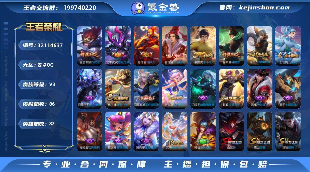 【高性价比·白虎志·麒麟志·大圣娶亲·地狱之眼·地狱火·可二次】YXw17291-安卓Q-82英雄-86皮肤-9王者印记-90铭文-贵族积分0【贵族3】【3传说】【因赛季更新游戏段付以上号为准!】 【传说皮肤】:百里玄策白虎志,宫本武藏地狱之眼,孙悟空地狱火 【限定皮肤】:白起狰,姜子牙天穹之誓,狄仁杰阴阳师,嬴政白昼王子,吕布猎兽之王,夏侯惇朔风刀,典韦穷奇,狄仁杰万华元夜,达摩沙漠行僧,老夫子醍醐杖,程咬金演武夺筹,兰陵王金庭之子,花木兰瑞麟志,孙悟空大圣娶亲,牛魔御旌,李元芳云中旅人,钟馗驱傩正仪,杨玉环遇见飞天,太乙真人饕餮,鬼谷子原初探秘者,苏烈千军破阵,百里玄策白虎志,百里玄策原初追逐者,弈星混沌棋,沈梦溪大漠名商,明世隐疑决卦,裴擒虎李小龙,裴擒虎擒涛扼浪,狂铁御狮,米莱狄御霄,盾山御銮,上官婉儿梁祝,鲁班大师探海日志,阿古朵江河有灵,张良古海寻踪,鬼谷子天穹祈灯 【年限皮肤】:花木兰瑞麟志,百里玄策白虎志 【赛季限定】:白起狰,太乙真人饕餮,典韦穷奇,狂铁御狮,米莱狄御霄,牛魔御旌,盾山御銮,夏侯惇朔风刀,弈星混沌棋,明世隐疑决卦,老夫子醍醐杖,鬼谷子原初探秘者,狄仁杰万华元夜,程咬金演武夺筹,钟馗驱傩正仪,苏烈千军破阵,达摩沙漠行僧,兰陵王金庭之子,沈梦溪大漠名商,李元芳云中旅人,裴擒虎擒涛扼浪,鲁班大师探海日志,张良古海寻踪,鬼谷子天穹祈灯,姜子牙天穹之誓,东皇太一噬灭天穹,百里玄策原初追逐者 【战令限定】:嬴政白昼王子,吕布猎兽之王 【史诗皮肤】:阿古朵江河有灵,裴擒虎李小龙,百里玄策原初追逐者,上官婉儿梁祝,狄仁杰鹰眼统帅,花木兰瑞麟志,孙悟空大圣娶亲,嬴政白昼王子,杨玉环遇见飞天,程咬金功夫厨神,蔡文姬舞动绿茵,百里守约特工魅影,雅典娜冰冠公主,兰陵王暗隐猎兽者,吕布圣诞狂欢,墨子金属风...