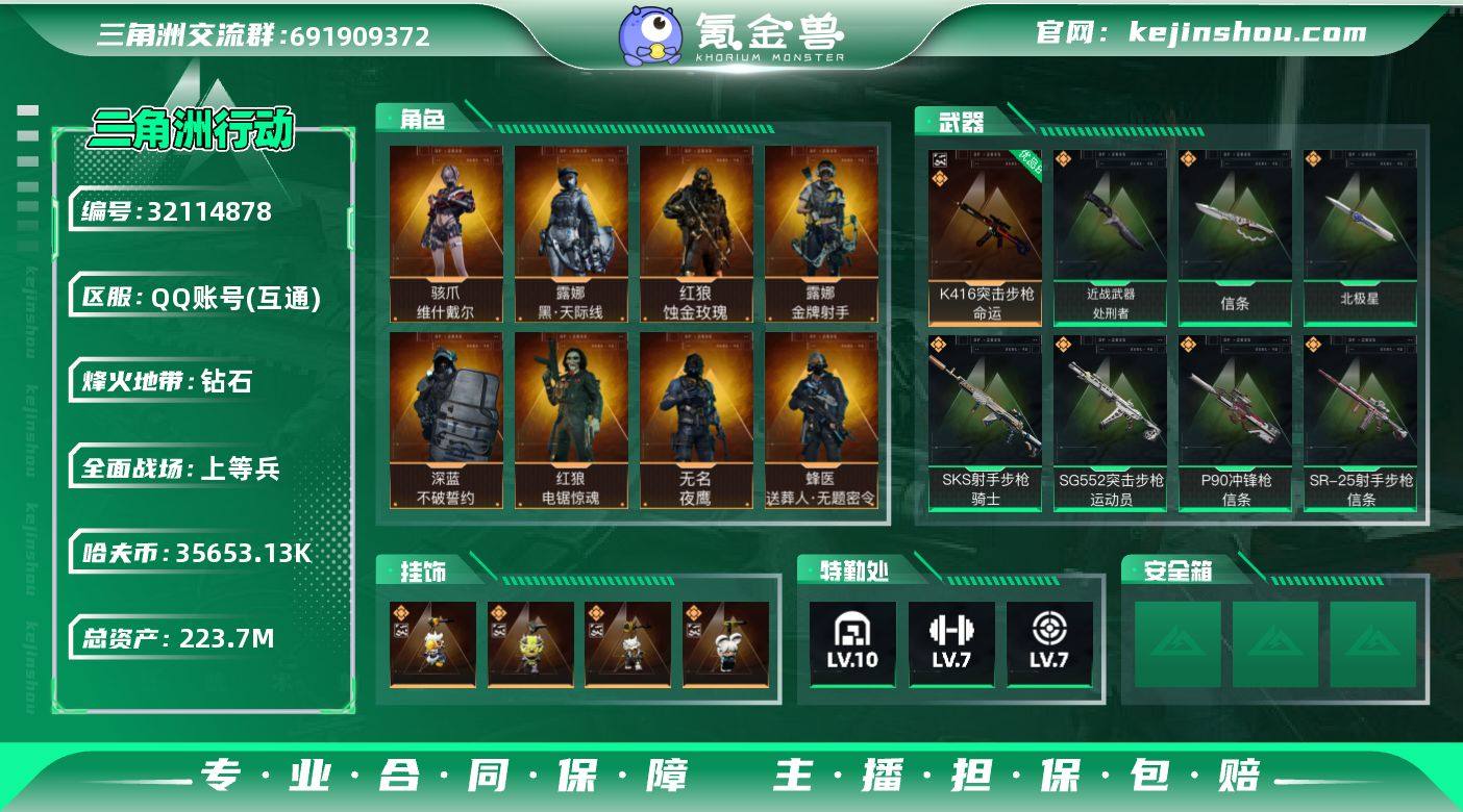 实名:可二次实名 总资产:223.7M 哈夫币:35653.13K 烽火地带段位:钻石 烽火地带等级:60 全面战场段位:上等兵 全面战场等级:50 10级仓库,7级训练中心,7级靶场,6级指挥中心,2级潜水中心,3级防具台,3级工作台,3级制药台,3级技术中心,2级收藏室 战术部门等级:4 战斗部门等级:4 医疗部门等级:4 研发部门等级:4 后勤部门等级:4 曼德尔砖-气象感应:0 曼德尔砖-命运王牌:0 曼德尔砖-电玩高手:0 曼德尔砖-美杜莎:0