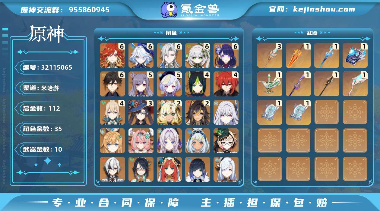 冒险等级:60 总黄数:112 5星角色数:35 5星武器数:10 原石数量:3155 相遇之缘数量:0 纠缠之源数量:0 6命玛薇卡,6命芙宁娜,6命那维莱特,6命纳西妲,6命雷电将军,6命钟离,5命刻晴,5命七七,4命提纳里,4命迪卢克,4命琴,3命莫娜,2命希诺宁,2命迪希雅,0命丝柯克,0命爱可菲,0命瓦雷莎,0命茜特菈莉,0命玛拉妮,0命艾梅莉埃,0命阿蕾奇诺,0命闲云,0命妮露,0命夜兰,0命申鹤,0命荒泷一斗,0命珊瑚宫心海,0命宵宫,0命神里绫华,0命枫原万叶,0命胡桃,0命甘雨,0命达达利亚,0命可莉,0命温迪 6命班尼特,6命菲米尼,6命久岐忍,6命卡齐娜,6命欧洛伦,6命香菱,6命行秋,6命夏洛蒂,6命夏沃蕾,6命芭芭拉,6命北斗,6命重云,6命迪奥娜,6命多莉,6命珐露珊,6命菲谢尔,6命九条裟罗,6命坎蒂丝,6命柯莱,6命雷泽,6命罗莎莉亚,6命鹿野院平藏,6命米卡,6命诺艾尔,6命凝光,6命砂糖,6命托马,6命烟绯,6命瑶瑶,6命早柚,5命嘉明,4命五郎,3命琳妮特,3命绮良良,3命安柏,3命莱依拉,3命辛焱,2命伊安珊,2命凯亚,2命云堇,1命赛索斯,1命卡维,1命丽莎,0命蓝砚 精3天空之脊,精1焚曜千阳,精1静水流涌之辉,精1万世流涌大典,精1千夜浮梦,精1薙草之稻光,精1贯虹之槊,精1天空之翼,精1四风原典 100%侦察骑士,古恩希尔德的传承,帆影游风,海风之梦,花时来信,极夜真梦,冷花幽露,霓裾翩跹,琪花星烛,莎邦之息,宿雪桃红,岁夜欢哗,玄玉瑶芳,星与月之约,雨化竹身,殷红终夜,叶隐芳名,致教会自由人 卖家说:价格可谈,月之篇断氪了,老的强力角色基本都有。