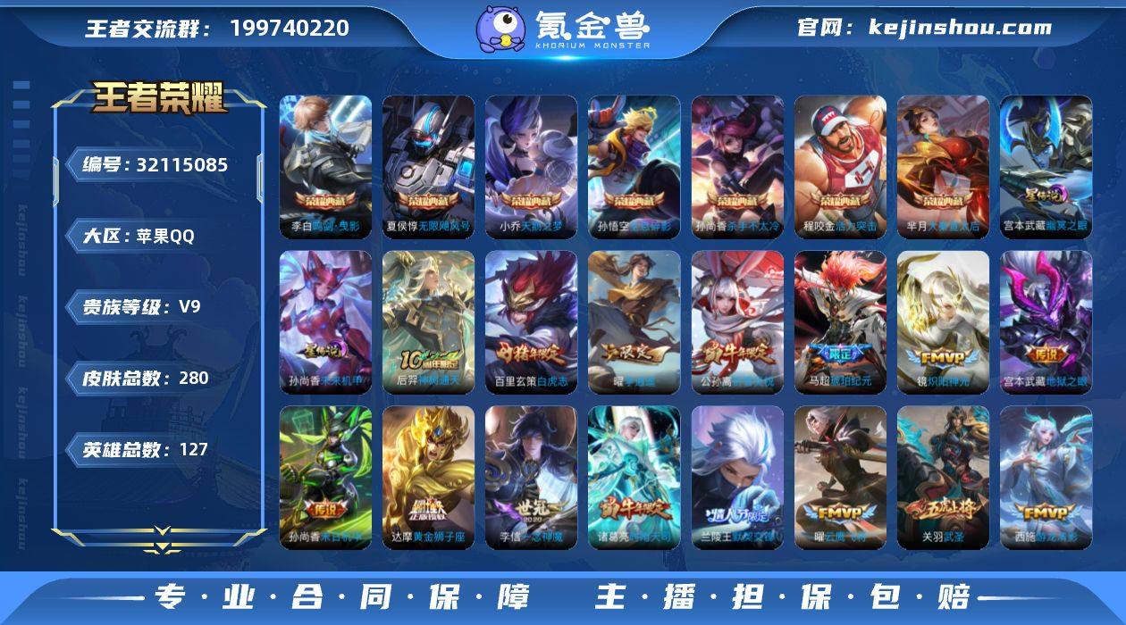【秒换绑】苹果Q-V9-至尊星耀II段位-127英雄-280皮肤-7典藏皮肤-30传说-86史诗 【英雄全皮】:孙权全皮,影全皮 【荣耀典藏】:孙悟空全息碎影,夏侯惇无限飓风号,小乔天鹅之梦,孙尚香杀手不太冷,芈月大秦宣太后,程咬金活力突击,李白鸣剑曳影 【传说皮肤】:后羿神树通天,马超琥珀纪元,西施游龙清影,曜李逍遥 ,李元芳飞鸢探春,兰陵王默契交锋,公孙离祈雪灵祝,诸葛亮时雨天司,铠绛天战甲,镜炽阳神光,虞姬启明星使,孙悟空零号赤焰,关羽武圣,曜云鹰飞将,李信一念神魔,刘备时之恋人,貂蝉猫影幻舞,张良黄金白羊座,干将莫邪久胜战神,虞姬云霓雀翎,达摩黄金狮子座,百里玄策白虎志,花木兰冠军飞将,梦奇胖达荣荣,后羿黄金射手座,孙尚香末日机甲,宫本武藏地狱之眼,孙悟空地狱火,武则天海洋之心,狄仁杰超时空战士 【限定皮肤】:狄仁杰阴阳师,赵云皇家上将,墨子神迹守卫,嬴政优雅恋人,鲁班七号狮舞东方,阿轲迷踪丽影,吕布御风骁将,周瑜赤莲之焰,元歌云间偶戏,夏侯惇朔风刀,典韦蓝屏警告,马可波罗逐梦之星,马可波罗暗影游猎,狄仁杰魔术师,狄仁杰万华元夜,达摩星际陆战队,项羽海滩派对,老夫子醍醐杖,老夫子航海奇遇记,关羽冰锋战神,关羽武圣,程咬金演武夺筹,刘邦夺宝奇兵,韩信飞衡,兰陵王默契交锋,兰陵王驯魔猎人,兰陵王金庭之子,花木兰默契交锋,亚瑟潮玩骑士王,孙悟空大圣娶亲,孙悟空零号赤焰,牛魔御旌,牛魔奔雷神使,李元芳银河之约,虞姬霸王别姬,虞姬启明星使,钟馗神迹守卫,钟馗驱傩正仪,女娲朔望之晖,干将莫邪冰霜恋舞曲,雅典娜单词大作战,蔡文姬繁星吟游,鬼谷子原初探秘者,诸葛亮时雨天司,铠青龙志,百里玄策白虎志,百里守约朱雀志,弈星混沌棋,公孙离祈雪灵祝,沈梦溪星空之诺,沈梦溪大漠名商,明世隐疑决卦,裴擒虎天狼狩猎者,裴擒虎...