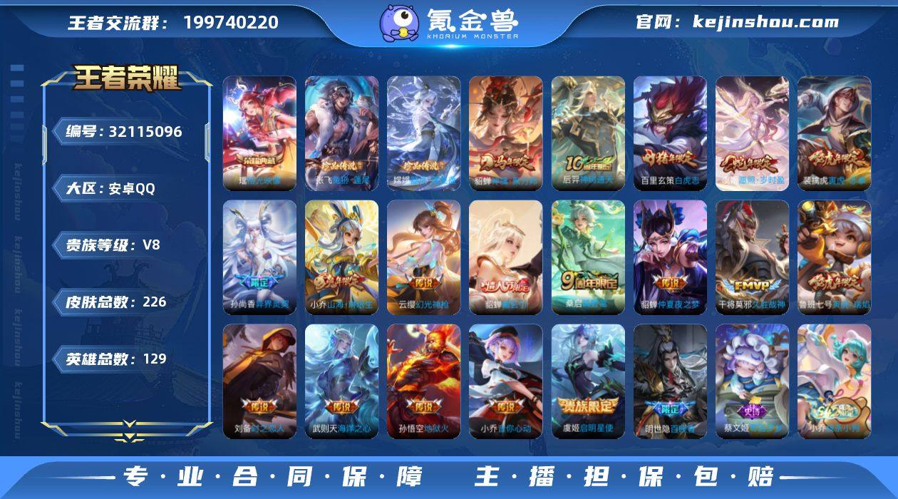 0B656I无二次226皮肤水晶2珍品传说2女号传说18优质限定19 信用分合格 钱包已注销 水晶皮肤:武则天,拾光映像, 珍品传说皮肤:器灵·落星盏,兔狲·蓬尾, 新传说限定:神骥·聚万邦, 传说限定:白虎志,寅虎·赤拳,山海·琳琅生,貂蝉曦玄引,异界灵契,寅虎·瑞焰,愿照·岁时盈,神树通天,启明星使, 传说皮肤:幻光神枪,音你心动-小乔,地狱火,时之恋人-刘备,海洋之心,仲夏夜之梦,久胜战神,鸣野蒿, 新史诗限定:万灵启世,守夜人,织梦人,雪豹·霜爪,涂山容容,百晓客, 史诗限定:寅虎·御盾,超元猎域,炽弈燎原, 新史诗皮肤:绮世丹青,石田雨龙,百相守梦-黄忠,奇遇梦乡, 优质史诗皮肤:晚萤,修罗,青蛇,魅语,真我赫兹(百里守约),龙鼓争鸣,白蛇,遇见神鹿, 周年皮肤:鹤鸣心笺,神树通天, 珍宝阁:万物之道, 史诗皮肤:地狱岩魂,圣诞狂欢,末日机甲-吕布,无心,幽灵船长,水晶猎龙者,节奏热浪,鬼剑武藏,千年之狐,暗隐猎兽者,热力回旋,缤纷独角兽,金属风暴,魅力维加斯,女仆咖啡,暗夜贵公子,冰雪圆舞曲,圣诞恋歌,心灵骇客,偶像歌手,黄金分割率,滕王阁序,水果甜心,鹰眼统帅,逐浪之夏,特工魅影,乱世虎臣