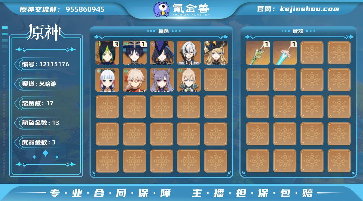 【金色角色】:杜林(0命),克洛琳德(0命),阿蕾奇诺(0命),娜维娅(0命),流浪者(1命),提纳里(3命),神里绫华(0命),枫原万叶(0命),琴(0命),刻晴(0命) 【拥有武器】:黑蚀(精1),裁叶萃光(精1),天空之傲(精1) 【紫色角色】:爱诺(1命),伊法(1命),伊安珊(0命),卡齐娜(1命),赛索斯(5命),嘉明(1命),夏沃蕾(2命),菲米尼(0命),琳妮特(0命),绮良良(4命),卡维(1命),米卡(0命),珐露珊(1命),莱依拉(1命),坎蒂丝(0命),柯莱(2命),托马(1命),九条裟罗(1命),烟绯(2命),罗莎莉亚(1命),辛焱(0命),砂糖(0命),雷泽(5命),菲谢尔(3命),丽莎(2命),北斗(1命),香菱(4命),安柏(0命),班尼特(5命),芭芭拉(0命),凝光(4命),诺艾尔(1命),凯亚(1命),重云(1命)