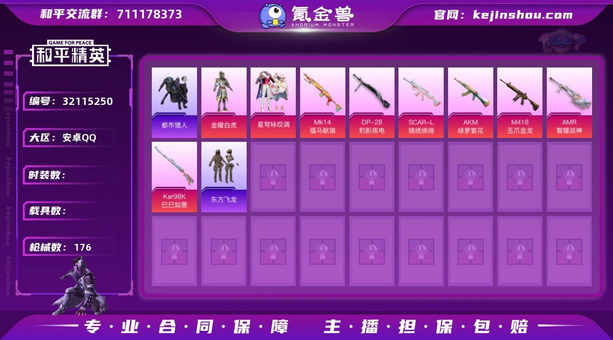 安卓 手Q-7粉装-5特效枪-1载具-2粉色飞行器-33236热力值-3王牌印记-84套装-111枪皮 【热门品类】:套装-浪漫天命,角色-忠猛周仓,角色-忠真马岱,角色-忠义严颜,套装-龟仙人,套装-暗影哥特,大砍刀-青龙偃月刀,撬棍-龙胆亮银枪 【粉色套装】:粉装-第五大道,角色-茉莉星,粉装-天幕蝎影,粉装-射星猎手,粉装-无畏白羊,粉装-室女星神,粉装-莲影清波 【粉色枪皮等级】:AKM-绿萝繁花(五级),Kar98K-巳巳如意(五级),M24-莲影清波(五级),DP-28-豹影疾电(五级),MG-36-沧焰双生(五级) 【粉色载具】:赤兔 【粉色枪皮】:AKM-绿萝繁花,Kar98K-巳巳如意,M24-莲影清波,DP-28-豹影疾电,MG-36-沧焰双生 【粉色飞行器】:萌物绒绒飞行器 【粉色降落伞】:未来歌姬降落伞,莲影清波降落伞,龙行天下降落伞,绯穹魔姬降落伞,炫彩糖果降落伞 【稀有套装】:套装-龟仙人,套装-巳巳如意,套装-雪国风尚,套装-炫彩糖果,角色-乐音,套装-蜜露汐语,套装-朱霞炽焰,套装-凌霄紫焰,套装-擎苍青焰,角色-紫俏灵猫 【稀有枪皮】:AUG-冰晶雪宝,AKM-缤纷海域,AKM-龙的传人,M16A4-莲影清波,SCAR-L-是爱神辣,SCAR-L-炫彩节奏,SCAR-L-粉锦千层,SCAR-L-冷漠罗丽,M416-红色方程式,M416-绯红前夜,GROZA-懵萌河马,GROZA-酷泡奶龙,GROZA-荧海星豚,AUG-天降萌叽,AUG-耀粉歌者,M762-天降萌叽,Mk47-摩登王国,Mk47-炫光之旅,G36C-懵萌河马,G36C-蛇蝎美人,G36C-星穹咏叹调,AC-VAL-天降萌叽,ARX-凌霄紫焰,UZI-天降萌叽,UMP45-炫光之旅,UMP45-生命誓言,Vector-彩虹符号,Vector-龙行天下,汤姆逊-耀粉歌者,野牛-粉锦千层,JS9-凌霄紫焰,Kar98K-影袭,Mini14-穿刺龙虾,Mk14-是爱神辣,莫辛纳甘-懵萌河马,AMR-喜羊羊与灰太狼,M417-惊鸿侠骨,MK20-H-莲影清波,M200-惊鸿侠骨,S686-千金淑猫,S1897-炫彩...