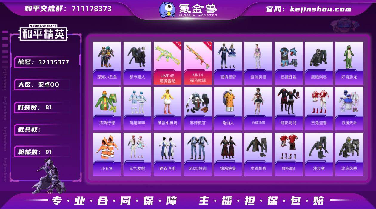 M1046727【地铁满天赋身法号特效2 小雾神 浪漫天命,都市猎人,深海小丑鱼,小丑鱼,暗影哥特,】安卓手Q-2特效枪-81套装-91枪皮-0王牌印记-不朽星钻Ⅲ-23470热力值【2特效枪】Mk14-福马献瑞[5级],UMP45-萌骑冒险[4级]【6稀有】浪漫天命,都市猎人,深海小丑鱼,小丑鱼,暗影哥特,AKM-缤纷海域【1飞行器】马上有福飞行器【2头盔】幻影战神头盔,深海小丑鱼头盔【1背包】深海小丑鱼背包【164其它衣服和枪皮】都市漫游者,狙击之神,彩虹骑师,绮丽涂鸦,龙的传人,完美偶像,破蛋小黄鸡,福马献瑞,幻世战舞者,元素星魂,特战装甲,潮流炫酷,破晓战魂,马上来财,战术大师,娇憨猪猪,沙漠毒蛇,元气发射,黑色伏地魔,冷酷挑战者,白糯汤圆,角色-紫俏灵猫,牛气冲天,长空猛禽,雪国风尚,冰冻风暴,清新柠檬,SS22特训,SS36特训,云魄琉璃,琴音绮想,漫步者,暗金炫舞,麻辣教官,绯格组合,青涩时光,SS25特训,极地朋克,好奇恐龙,SS23特训,青翼流星,湖蓝色名流,SS37特训,SS35特训,冷焰舞者,SS21特训,水银刺客,黄色伏地魔,龟仙人,迅捷狂鲨,魅力单车,竞技名士,锦衣飞扬,黄色运动,雪鹰学院,探宝勇士,白色伏地魔,街头潮人,特训学院,鹰眼刺客,萌趣咩咩,画境星梦,弄潮海豚,书海巡游,白熊同盟,耀眼新星,玉兔迎春,深蓝色名流,柠萌假日,雨过天青,旭日情侣,SS20特训,惊鸿侠骨,福星高照,红釉青花,海岛探路者,SCAR-L-夜灯,MG-36-薄荷星砂,M16A4-幻世战舞者,UZI-炫彩糖果,SCAR-L-炫彩节奏,S12K-破晓战魂,SPAS-12-狂鲨锋刃,QBZ-彩虹符号,汤姆逊-像素花束,AKM-破晓战魂,MG3-幻世战舞者,AKM-影袭,MP5K-画境星梦,AA12-G-画境星梦,沙漠之鹰-雨过天青,蜜獾-娇憨猪猪,燃烧瓶-福马献瑞,撬棍-冰晶雪宝,M416-绯红前夜,S12K-夜灯,平底锅-娇憨猪猪,ACE32-冰晶雪宝,Mk47-乌木金纹,蜜獾-启元战纹,汤姆逊-耀粉歌者,S12K-娇憨猪猪,S686-彩虹符号,M
