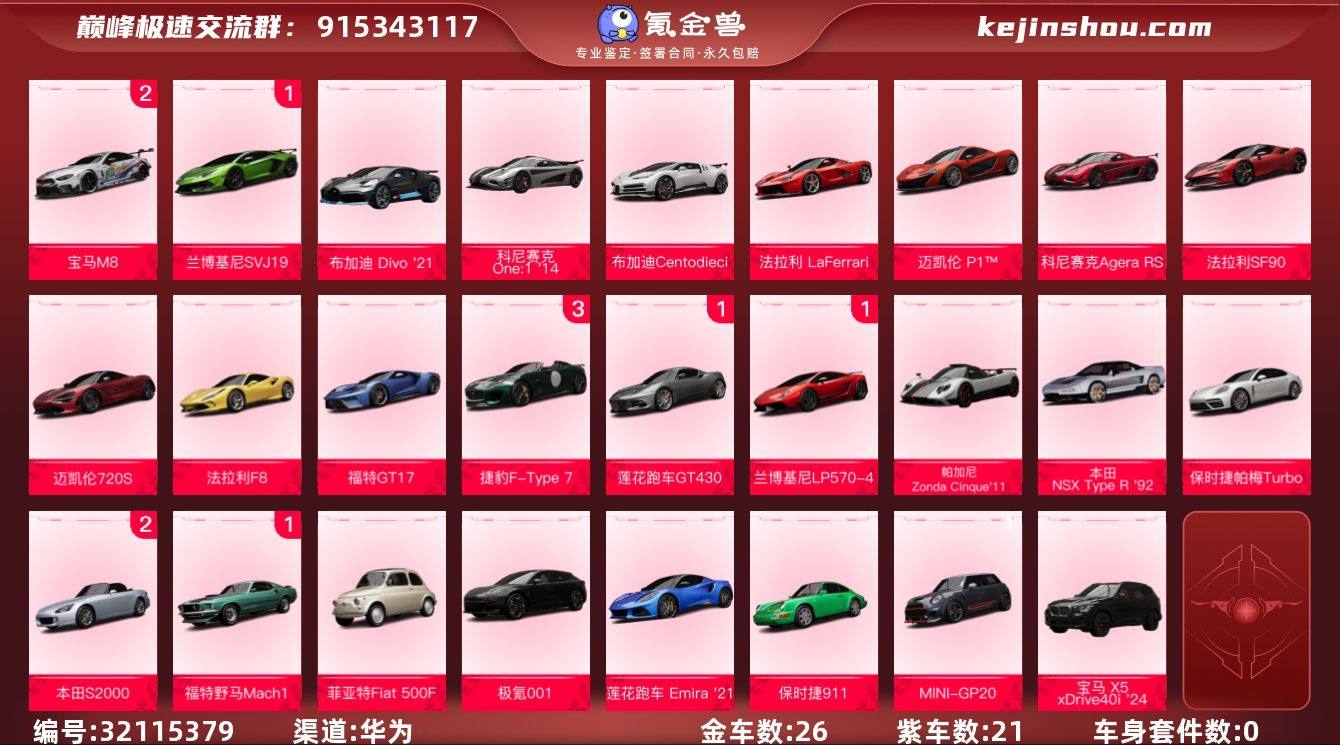 金车数:26 紫车数:21 0阶宝马 X5 xDrive40i '24 2阶本田 S2000 '09,1阶福特野马Mach1,0阶菲亚特500F,0阶极氪001,0阶莲花跑车 Emira '21,0阶保时捷911,0阶MINI-GP20 3阶捷豹F-TYPE,1阶莲花跑车GT430,1阶兰博基尼LP570-4,0阶帕加尼Zonda Cinque'11,0阶本田NSX Type R '92,0阶保时捷帕梅Turbo 2阶宝马M8,1阶兰博基尼SVJ19,0阶布加迪 Divo '21,0阶科尼赛克 One:1 '14,0阶布加迪Centodieci '20,0阶法拉利LaFerrari `14,0阶迈凯伦 P1™,0阶科尼赛克Agera RS,0阶法拉利SF90,0阶迈凯伦720S,0阶法拉利F8,0阶福特GT17 卖家说:急出
