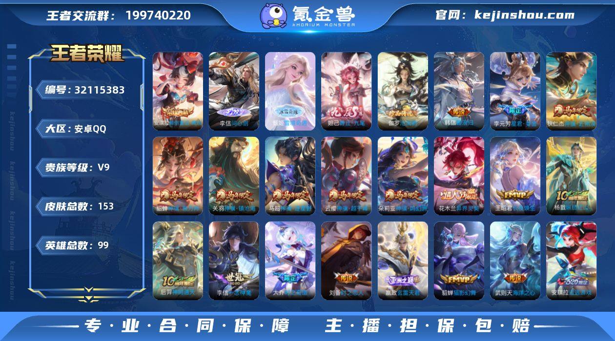 0B6BYK可二次无双3水晶1珍品传说1女号传说24优质限定24 信用分合格 钱包已注销 水晶皮肤:颠倒童话·魔镜, 无双皮肤:问心剑,青丘·九尾,雪境奇遇-甄姬, 珍品传说皮肤:沧流箭, 新传说限定:神骥·镇沧海,异界灵契-花木兰,神骥·逐星野,神骥·越千峰,神骥·聚万邦,神骥·赴朔漠,星君·娄金,神骥·鸣幻洲, 传说限定:追逃游戏(亚瑟),玄雷天君,追逃游戏(安琪拉),百相守梦(张飞),大乔-时之奇旅,神树通天,启明星使, 新传说皮肤:长夜焕生, 传说皮肤:一念神魔,小动物乐团,灼幽烈阳,时之恋人-刘备,绛天战甲,海洋之心,猫影幻舞,音你闪耀, 新史诗限定:撼世英歌,万灵启世,百晓客, 史诗限定:曹操夜都魔契,默契交锋-花木兰,龙胆,谪仙醉月,青龙志,凤凰于飞, 新史诗皮肤:灵蛊蚀心,闲日渔趣,完美假期,电玩·兔顽号,奇遇梦乡,瓦猫非猫, 优质史诗皮肤:唤灵魅影,魅语,白蛇, 周年皮肤:鹤鸣心笺,神树通天, 珍宝阁:锁墨魂, 史诗皮肤:地狱岩魂,末日机甲-吕布,无心,幽灵船长,猫狗日记-孙策,千年之狐,魅力维加斯,偶像歌手,水果甜心,绅士熊喵,电玩·爆裂旋风,乐园奇幻夜 贵族9 荣耀典藏1 无双3 珍品传说1 传说皮肤26 史诗皮肤38 皮肤数量153 皮肤价值:134224 英雄99 至尊星耀IV 总场次594