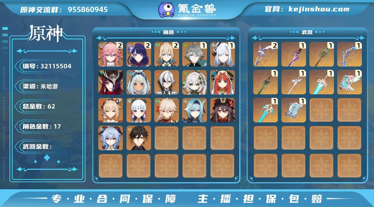 62黄 风元素:0命枫原万叶, 0命恰斯卡, 0命温迪 火元素:0命阿蕾奇诺, 0命宵宫, 0命胡桃, 0命可莉 水元素:0命玛拉妮, 0命妮露, 1命夜兰 雷元素:2命雷电将军, 2命八重神子, 0命克洛琳德 冰元素:1命申鹤, 0命优菈, 0命甘雨, 0命神里绫华, 0命埃洛伊 岩元素:0命钟离, 0命荒泷一斗 草元素:1命艾尔海森, 0命纳西妲 【常驻五星角色及命座】 风元素:2命琴, 0命梦见月瑞希 火元素:4命迪卢克 水元素:0命莫娜 雷元素:3命刻晴 冰元素:3命七七 单手剑:精1天空之刃, 精1磐岩结绿, 精1磐岩结绿, 精1雾切之回光, 精1风鹰剑 双手剑:精1天空之傲, 精1苇海信标 长柄武器:精1和璞鸢, 精1薙草之稻光 法器:精1四风原典, 精1天空之卷, 精1神乐之真意 弓:精1冬极白星, 精2阿莫斯之弓 【角色皮肤】 五星角色:神里绫华-花时来信, 可莉-琪花星烛 四星角色:菲谢尔-极夜真梦, 丽莎-叶隐芳名, 芭芭拉-闪耀协奏, 凝光-纱中幽兰