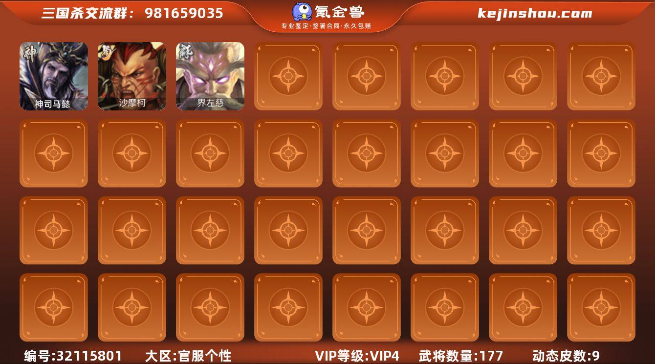 【2516】官阶:中军将军;VIP等级:VIP4;史诗武将数量:4;动态皮肤数量:9;武将总数:177;史诗宝珠数量:0;将魂数量:2488;神将:2;魏国史诗武将:0;蜀国史诗武将:1;吴国史诗武将:0;群史诗武将:1 神司马懿,神吕蒙,沙摩柯,界左慈,神吕蒙-心生万象,神司马懿-鉴往知来(动态),诸葛亮-龙年限定(动态),诸葛果-蛇年限定(动态),陆逊-龙年七夕(动态),鲁肃-蛇年端午(动态),皇甫嵩-奋钺振旅(动态),左慈-蛇年限定(动态)