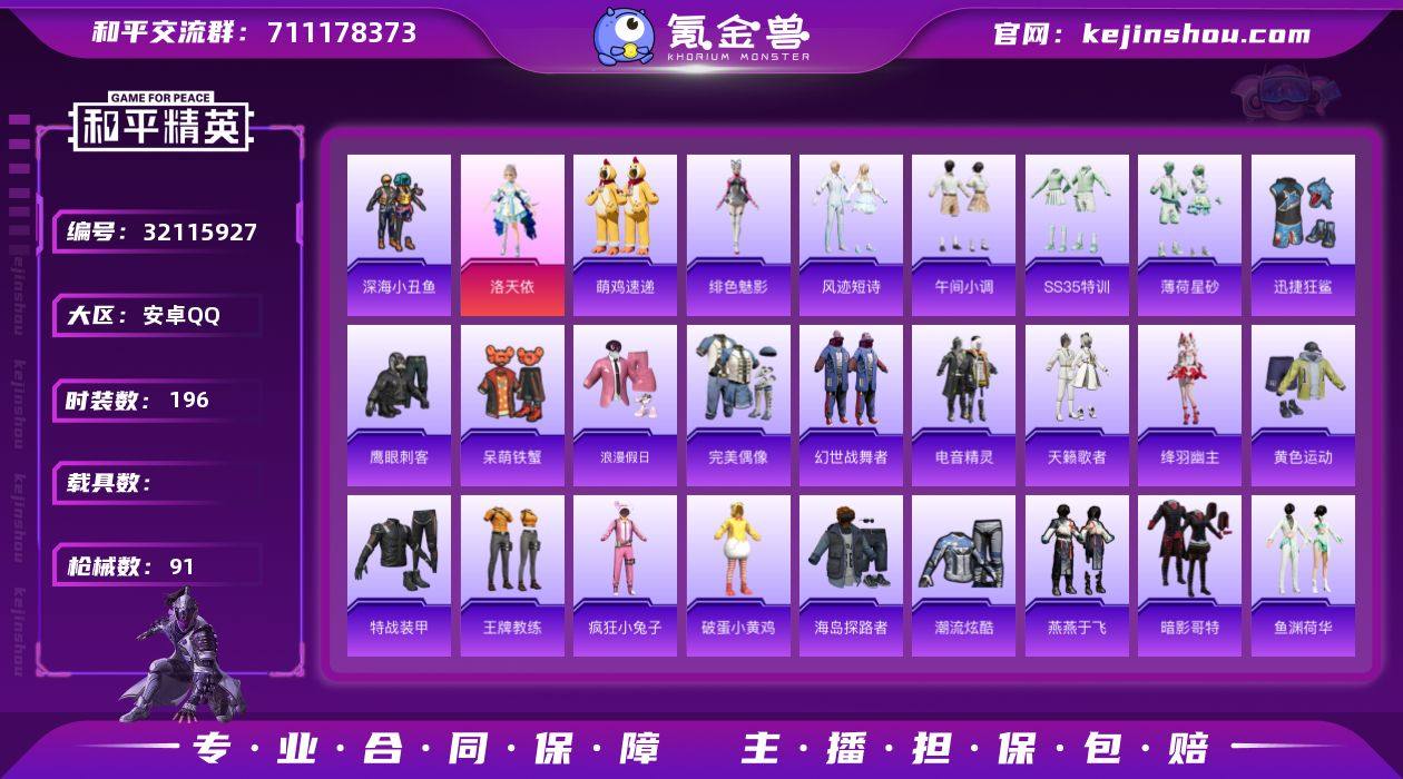 kk2470693-F312 安卓手Q-2王牌印记-1粉装-6特效枪-22817热力值-47套装-91枪皮-暗影哥特,深海小丑鱼-地铁天赋38点 【1粉装】角色-洛天依 【6特效枪】AKS-74U-森灵之息/5级,UMP45-萌骑冒险/2级,Mk14-福马献瑞/5级,DP-28-豹影疾电/5级,MG-36-沧焰双生/5级,Kar98K-巳巳如意/5级 【4稀有紫装】暗影哥特,深海小丑鱼,迅捷狂鲨,小丑鱼 【47稀有时装】洛天依,SS35特训,午间小调,SS36特训,琴音绮想,恋语绒绒,画境星梦,绛羽幽主,暗影哥特,深海小丑鱼,小丑鱼,迅捷狂鲨,绯色魅影,萌鸡速递,书海巡游,风迹短诗,薄荷星砂,雪国风尚,蜜桃派对,鱼渊荷华,燕燕于飞,战术大师,潮流炫酷,青翼流星,SS37特训,黄色运动,绯格组合,漫步者,特战装甲,浪漫假日,幻世战舞者,狙击之神,红釉青花,鹰眼刺客,雨过天青,福马献瑞,冰冻风暴,马上来财,完美偶像,破蛋小黄鸡,疯狂小兔子,海岛探路者,弄潮海豚,呆萌铁蟹,天籁歌者,电音精灵,王牌教练 【90稀有枪械】MG3-梦海之灵,平底锅-精灵梦叶罗丽,MG-36-沧焰双生/5级,Kar98K-巳巳如意/5级,AKS-74U-森灵之息/5级,DP-28-豹影疾电/5级,DBS-风迹短诗,莫辛纳甘-风迹短诗,Win94-乌木金纹,MK12-风迹短诗,MK12-乌木金纹,ACE32-画境星梦,M1加兰德-画境星梦,MP5K-画境星梦,蜜獾-绯穹魔姬,SPAS-12-狂鲨锋刃,UZI-炫彩糖果,AA12-G-画境星梦,平底锅-画境星梦,M249-冰晶雪宝,Mk47-风迹短诗,烟雾弹-咒蚀之裁,UMP45-海盐豹豹,AKS-74U-乌木金纹,蜜獾-风迹短诗,Famas-乌木金纹,Famas-霓彩脉冲,破片手榴弹-拽到爆炸,Mk14-薄荷星砂,AKS-74U-鸡智如我,MG-36-薄荷星砂,SCAR-L-绿洲时空,PKM-啾咪啾咪,SLR-霓彩脉冲,AUG-紫晶流影,AKM-霓彩脉冲,M416-红色方程式,AKM-影袭,AKM-缤纷海域,AKM-破晓战魂,SCA