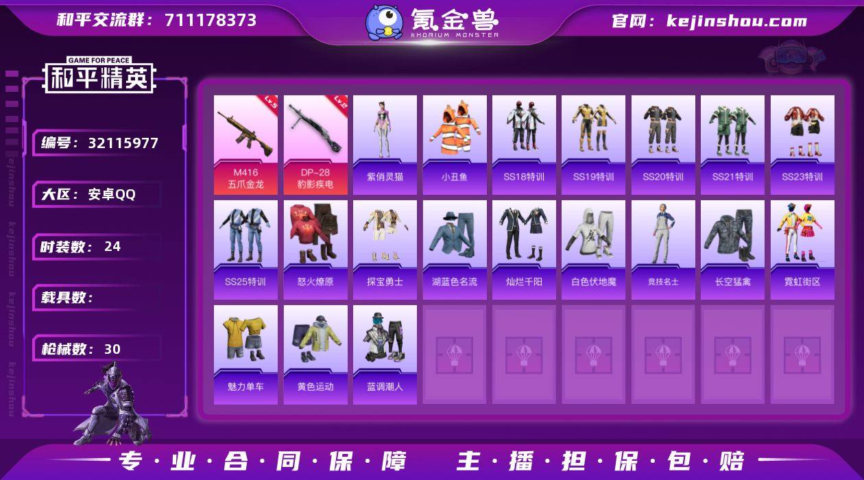 CH415+【连体号-1粉装-老六服-法斗尖角面罩-V7王者7传说-121皮肤-3太阳Q可二次】安卓Q区-1粉装-17917热力值-46套装-73枪皮【优质套装】: PEL轰鸣竞梦者【稀有武器皮肤】: M416-红色方程式 M416-乌木金纹 M416-蓝色火焰 M416-夜灯 AKM-乌木金纹 AKM-破晓战魂 AKM-霓虹街区 SCAR-L-红色方程式 SCAR-L-乌木金纹 SCAR-L-扶摇飞仙 SCAR-L-炫彩节奏 M16A4-夜灯 M16A4-生命誓言 GROZA-乌木金纹 GROZA-春暖花开 GROZA-黑色刀锋 GROZA-马卡龙 AUG-乌木金纹 AUG-魔法学院 QBZ-原初圣火 QBZ-乌木金纹 M762-拳皇97 M762-乌木金纹 M762-绯红前夜 M762-牛气冲天 Kar98K-红色方程式 Kar98K-彩虹符号 Kar98K-勇闯险境 M24-众神之王 SKS-勇闯险境 SKS-乌木金纹 SKS-夜灯 VSS-华贵君王 VSS-黑色刀锋 Mini14-生命誓言 Mini14-金鼠迎春 Mini14-原初圣火 Mini14-耀粉歌者 Mini14-乌木金纹 SLR-众神之王 SLR-四圣焕新 UZI-生命誓言 UZI-乌木金纹 UZI-红色方程式 UZI-众神之王 UMP45-生命誓言 UMP45-乌木金纹 UMP45-快乐主宰 Vector-乌木金纹 Vector-彩虹符号 Vector-黑色刀锋 汤姆逊-耀粉歌者 汤姆逊-乌木金纹 汤姆逊-勇闯险境 MP5K-众神之王 S686-乌木金纹 S686-深海曼妙 S1897-春暖花开 S1897-天启纪元 S1897-勇闯险境 S12K-乌木金纹 M249-拳皇97 M249-乌木金纹 DP-28-原初圣火 P92-拳皇97 P18C-原初圣火 平底锅-缤纷糖果 平底锅-众神之王 平底锅-原初圣火 平底锅-勇闯险境 平底锅-拳皇97 平底锅-黑色刀锋 撬棍-传奇侦探【其他套装】: PEL轰鸣竞梦者 雪山精英 迷域探索者 红酒骑士 云纹魔法士 金鼠迎春 夏日音浪 SS