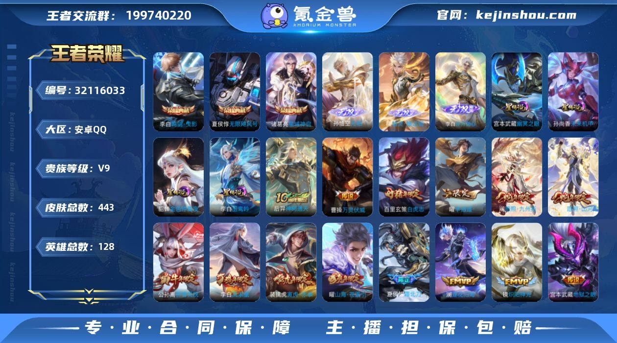 【秒换绑】安卓Q-V9-最强王者段位-128英雄-443皮肤-3典藏皮肤-3无双-42传说-139史诗 【英雄全皮】:夏侯惇全皮,李白全皮,孙权全皮,刘备全皮,鬼谷子全皮,苏烈全皮,狂铁全皮,敖隐全皮,曜全皮,蒙恬全皮,澜全皮,夏洛特全皮,司空震全皮,戈娅全皮,空空儿全皮,影全皮 【荣耀典藏】:夏侯惇无限飓风号,李白鸣剑曳影,诸葛亮星域神启 【无双皮肤】:孙悟空无相,曜器灵螭龙剑,李白碎月剑心 【传说皮肤】:后羿神树通天,曹操万灵伏威,司空震愿照山河定,澜愿照九州拓,云缨幻光神枪,裴擒虎祥瑞亨通,桑启鸣野蒿,夏侯惇霜北刀,典韦战鼓燎原,铠琥珀纪元,澜逐花归海,兰陵王影龙天霄,澜电玩雷克斯,夏洛特浮生妄,孙悟空齐天大圣,曜山海苍雷引,李白诗剑行,马超无双飞将,孙策挚爱之约,孙策末日机甲,裴擒虎寅虎赤拳,鲁班七号寅虎瑞焰,孙尚香异界灵契,赵云淬星耀世,曜李逍遥 ,公孙离祈雪灵祝,诸葛亮时雨天司,铠绛天战甲,镜炽阳神光,虞姬启明星使,孙悟空零号赤焰,关羽武圣,曜云鹰飞将,李信一念神魔,刘备时之恋人,百里玄策白虎志,后羿黄金射手座,诸葛亮武陵仙君,貂蝉仲夏夜之梦,李白凤求凰,孙尚香末日机甲,宫本武藏地狱之眼 【限定皮肤】:夏侯惇霜北刀,蔡文姬夏日便利店,虞姬夏日便利店,姜子牙天穹之誓,杨戬破阵退雄兵,李白谪仙醉月,狄仁杰阴阳师,廉颇寅虎御盾,赵云皇家上将,赵云引擎之心,赵云龙胆,赵云百木心枪,墨子神迹守卫,妲己热情桑巴,嬴政优雅恋人,孙尚香蔷薇恋人,孙尚香异界灵契,鲁班七号乒乒小将,鲁班七号寅虎瑞焰,庄周高山流水,高渐离玩趣恶龙,钟无艳超时空战士,白起夜都怪侠,芈月白晶晶,芈月幻夜卜梦,吕布猎兽之王,元歌云间偶戏,元歌无心,夏侯惇朔风刀,夏侯惇匿光决锋者,甄姬落雪兰心,马可波罗暗影游猎,马可波罗山海玄木吟,狄仁杰...