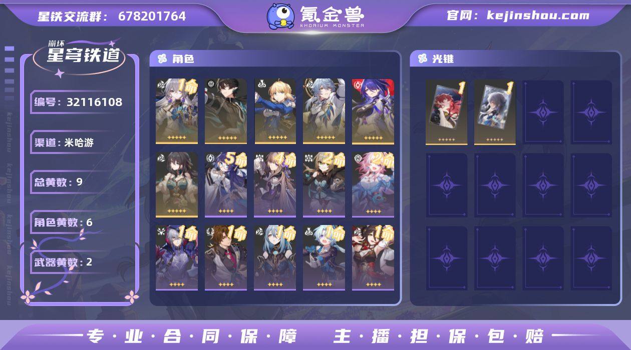 总黄数:9 五星光锥数:2 五星角色数:6 开拓等级:53 开拓者性别:女 星轨专票:0 梦华数量:0 星琼数量:42 1命布洛妮娅,0命丹恒·腾荒,0命Saber,0命星期日,0命黄泉,0命阮·梅 1精银河铁道之夜,1精但战斗还未结束 换绑材料:可提供换绑材料 邮箱状态:未绑定 psn绑定情况:否 taptap绑定情况:否 卖家说:急出可砍