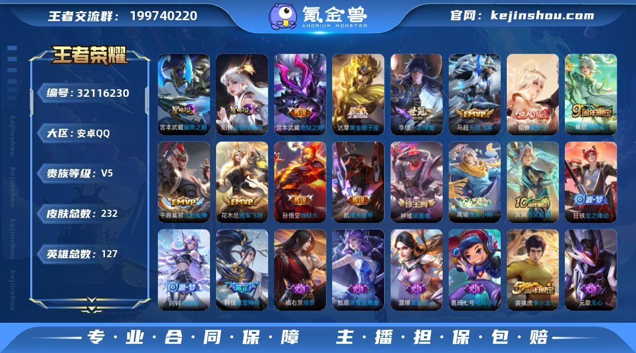 【c4151】发育路23段!打野男神号!马超无双飞将!地狱火!一念神魔!李小龙!2955星币!安卓Q-V5【特价出售,永久包赔】-最强王者段位-127英雄-232皮肤-10传说-49史诗 【英雄全皮】:孙权全皮,影全皮 【传说皮肤】:桑启鸣野蒿,貂蝉曦玄引,马超无双飞将,铠绛天战甲,李信一念神魔,干将莫邪久胜战神,达摩黄金狮子座,花木兰冠军飞将,宫本武藏地狱之眼,孙悟空地狱火 【限定皮肤】:蒙犽顽岩魄,大乔绒语心约,姜子牙天穹之誓,狄仁杰阴阳师,赵云皇家上将,孙尚香蔷薇恋人,元歌无心,狄仁杰万华元夜,达摩沙漠行僧,项羽海滩派对,韩信傲雪梅枪,兰陵王金庭之子,李元芳云中旅人,钟馗驱傩正仪,干将莫邪胡桃夹子,鬼谷子原初探秘者,鬼谷子五谷丰年,苏烈千军破阵,百里玄策原初追逐者,沈梦溪大漠名商,裴擒虎李小龙,裴擒虎擒涛扼浪,云中君纤云弄巧,上官婉儿梁祝,嫦娥拒霜思,鲁班大师探海日志,桑启海盐诗旅,阿古朵江河有灵,张良古海寻踪,蒙犽百解令,蒙恬荣光圣徽,鬼谷子天穹祈灯,伽罗琥珀纪元,貂蝉曦玄引,沈梦溪龙舞盛年,刘邦剑破天穹,程咬金群星魔术团,周瑜熔金海岸 【赛季限定】:鬼谷子原初探秘者,狄仁杰万华元夜,钟馗驱傩正仪,苏烈千军破阵,达摩沙漠行僧,兰陵王金庭之子,沈梦溪大漠名商,李元芳云中旅人,桑启海盐诗旅,裴擒虎擒涛扼浪,鲁班大师探海日志,张良古海寻踪,鬼谷子天穹祈灯,刘邦剑破天穹,姜子牙天穹之誓,东皇太一噬灭天穹,太乙真人谧流熔炉,钟馗虚灵犬护,亚瑟荣光之誓,百里玄策原初追逐者,蒙恬荣光圣徽,牛魔星界战将 【战令限定】:周瑜线条小狗 【史诗皮肤】:钟馗锁墨魂,周瑜线条小狗,女娲万灵启世,狂铁龙之律动,阿轲化蝶舞,牛魔星界战将,蒙犽顽岩魄,伽罗琥珀纪元,蒙恬荣光圣徽,蒙犽百解令,阿古朵江河有灵,元歌无心,鬼谷子五谷丰年,韩...