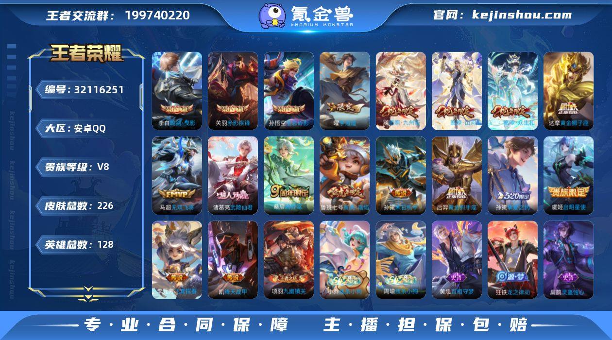 安卓Q-V8-至尊星耀III段位-128英雄-226皮肤-3典藏皮肤-15传说-60史诗 【英雄全皮】:影全皮 【荣耀典藏】:孙悟空全息碎影,李白鸣剑曳影,关羽赤影疾锋 【传说皮肤】:司空震愿照山河定,妲己愿照众生和,澜愿照九州拓,桑启鸣野蒿,马超无双飞将,孙策挚爱之约,孙策末日机甲,鲁班七号寅虎瑞焰,曜李逍遥 ,李元芳飞鸢探春,铠绛天战甲,虞姬启明星使,达摩黄金狮子座,后羿黄金射手座,诸葛亮武陵仙君 【限定皮肤】:蒙犽顽岩魄,姜子牙天穹之誓,杨戬破阵退雄兵,狄仁杰阴阳师,赵云皇家上将,赵云百木心枪,嬴政优雅恋人,鲁班七号寅虎瑞焰,庄周高山流水,芈月幻夜卜梦,狄仁杰魔术师,达摩星际陆战队,达摩沙漠行僧,项羽海滩派对,程咬金演武夺筹,韩信傲雪梅枪,兰陵王金庭之子,花木兰瑞麟志,李元芳云中旅人,虞姬启明星使,钟馗驱傩正仪,雅典娜黎明之约,鬼谷子五谷丰年,诸葛亮武陵仙君,黄忠火炮绅士,苏烈千军破阵,百里玄策原初追逐者,梦奇顽趣,沈梦溪大漠名商,裴擒虎李小龙,裴擒虎擒涛扼浪,米莱狄胡桃异想国,孙策挚爱之约,曜李逍遥 ,鲁班大师探海日志,桑启海盐诗旅,阿古朵江河有灵,张良古海寻踪,鬼谷子天穹祈灯,沈梦溪龙舞盛年,刘邦剑破天穹,程咬金群星魔术团,周瑜熔金海岸 【年限皮肤】:花木兰瑞麟志,鲁班七号寅虎瑞焰,司空震愿照山河定,妲己愿照众生和,澜愿照九州拓 【赛季限定】:程咬金演武夺筹,钟馗驱傩正仪,苏烈千军破阵,达摩沙漠行僧,兰陵王金庭之子,沈梦溪大漠名商,李元芳云中旅人,桑启海盐诗旅,裴擒虎擒涛扼浪,鲁班大师探海日志,张良古海寻踪,鬼谷子天穹祈灯,刘邦剑破天穹,姜子牙天穹之誓,东皇太一噬灭天穹,太乙真人谧流熔炉,钟馗虚灵犬护,甄姬逆浪荇歌,亚瑟荣光之誓,百里玄策原初追逐者,雅典娜黎明之约,梦奇顽趣,牛魔星界战将,项羽九幽...