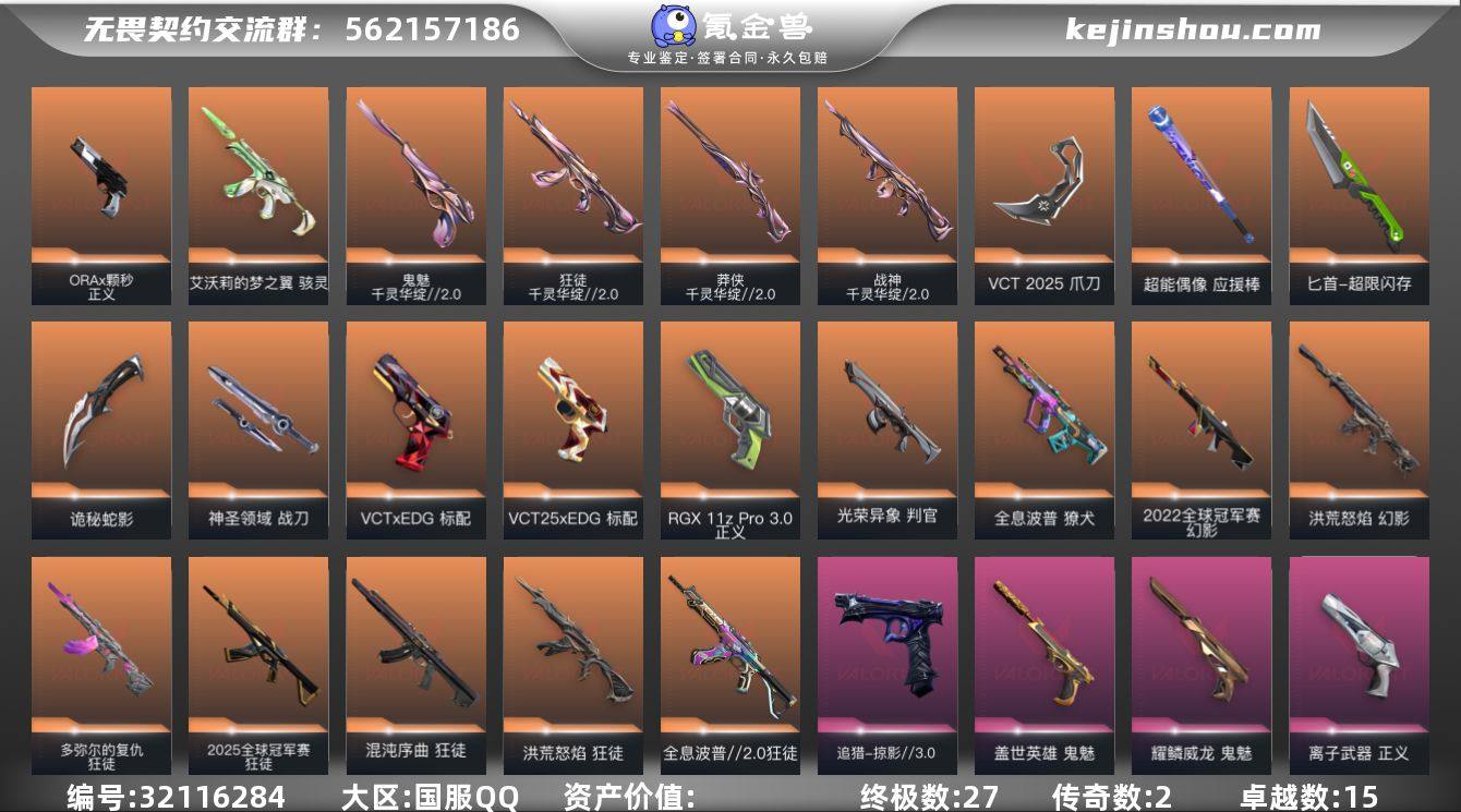 【套装】:千灵华绽//2.0套装,VCT 2025 赛季套装,VCTxEDG 队伍套装 【英雄】:幻棱,炼狱,维斯,暮蝶,钛狐,壹决,铁臂,捷风,雷兹,幽影,不死鸟,贤者,猎枭,蝰蛇,零,芮娜,奇乐,尚勃勒,霓虹,斯凯,夜露,星礈,K/O,海神,盖可,黑梦,钢锁 【近战武器】:近战武器-流风回雪,近战武器-剥皮小刀,近战武器-VCT 2025 爪刀,近战武器-超能偶像 应援棒,近战武器-超限闪存 匕首,近战武器-天御刀,近战武器-诡秘蛇影 军刀,近战武器-神圣领域 战刀 【狂徒】:狂徒-2025全球冠军赛,狂徒-洪荒怒焰,狂徒-混沌序曲,狂徒-全息波普//2.0,狂徒-多弥尔的复仇,狂徒-千灵华绽//2.0,狂徒-掠影,狂徒-盖亚的复仇,狂徒-紫阙金琅,狂徒-离子武器//2.0,狂徒-超能偶像,狂徒-诡秘蛇影 【幻影】:幻影-2022全球冠军赛,幻影-洪荒怒焰,幻影-天界神兵//2.0,幻影-异鳞魔蛇,幻影-超限闪存,幻影-神圣领域,幻影-聚合之力,幻影-末日之翼 【戍卫】:戍卫-掠影,戍卫-超能偶像,戍卫-浮光跃金,戍卫-月球哨兵,戍卫-折光棱晶 【獠犬】:獠犬-全息波普,獠犬-海洋之星//2.0,獠犬-神圣领域,獠犬-采蜜小蜂队,獠犬-模拟赫兹 【冥驹】:冥驹-堕天遗武,冥驹-模拟赫兹,冥驹-星云暗涌 【飞将】:飞将-盖亚的复仇,飞将-聚合之力,飞将-末日之翼 【莽侠】:莽侠-千灵华绽//2.0,莽侠-超限闪存,莽侠-诡秘蛇影,莽侠-月球哨兵 【战神】:战神-千灵华绽//2.0,战神-神圣领域,战神-采蜜小蜂队,战神-浮光跃金 【奥丁】:奥丁-末日之翼 【判官】:判官-光荣异象,判官-超能偶像,判官-诡秘蛇影,判官-采蜜小蜂队 【雄鹿】:雄鹿-紫阙金琅//2.0,雄鹿-模拟赫兹,雄鹿-月球哨兵 【骇灵】:骇灵-艾沃莉的梦之翼,骇灵-无限竞技,骇灵-浮光跃金,骇灵-星云暗涌 【蜂刺】:蜂刺-超限闪存,蜂刺-聚合之力,蜂刺-星云暗涌,蜂刺-...