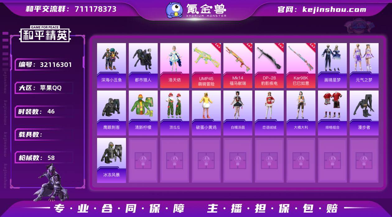M1046697【身法号1粉装-4特效枪 洛天依 都市猎人,深海小丑鱼】苹果手Q-1粉装-4特效枪-46套装-58枪皮-2王牌印记-超级王牌2星-16539热力值【1粉装】角色-洛天依【4特效枪】Kar98K-巳巳如意[5级],UMP45-萌骑冒险[2级],Mk14-福马献瑞[5级],DP-28-豹影疾电[5级]【3稀有】都市猎人,深海小丑鱼,AKM-缤纷海域【3飞行器】曦光华影飞行器,云朵驼驼飞行器,马上有福飞行器【96其它衣服和枪皮】魅力单车,缤纷果语,SS37特训,雨过天青,白色伏地魔,马上有钱,SS33特训,SS32特训,雪国风尚,书海巡游,SS34特训,漫步者,蓝色运动,天籁歌者,电音精灵,战术大师,极地朋克,旭日情侣,绯格组合,画境星梦,白糯汤圆,青翼流星,狙击之神,柠萌假日,顶瓜瓜,大橘大利,龙的传人,SS31特训,SS36特训,福马献瑞,冰冻风暴,滨海厨神,红釉青花,黄色名流,疯狂小兔子,街头潮人,清新柠檬,薄荷星砂,琴音绮想,元气之梦,破蛋小黄鸡,鹰眼刺客,恋语绒绒,M1加兰德-画境星梦,撬棍-冰晶雪宝,AWM-天降萌叽,平底锅-画境星梦,烟雾弹-冰氧夏日,PKM-雨过天青,Mini14-穿刺龙虾,AMR-雨过天青,破片手榴弹-小财神当家,SPAS-12-狂鲨锋刃,P90-紫矿核心,AA12-G-画境星梦,ACE32-冰晶雪宝,ACE32-画境星梦,G36C-霁蓝缠春,平底锅-无垠阁,燃烧瓶-福马献瑞,UZI-影袭,Vector-荒原烈焰,十字弩-异域银装,QBZ-洛神天依,平底锅-属我最6,AA12-G-雨过天青,M416-小财神当家,MP5K-画境星梦,20-H-狂鲨锋刃,MG3-幻世战舞者,UMP45-海盐豹豹,M417-玩趣呆呆,MG-36-薄荷星砂,GROZA-影袭,DP-28-彩虹符号,Kar98K-影袭,Mk47-洛神天依,M249-冰晶雪宝,沙漠之鹰-雨过天青,蜜獾-启元战纹,PKM-啾咪啾咪,S1897-炫彩节奏,M16A4-雨过天青,Kar98K-洛神天依,GROZA-福马献瑞,GROZA-暮色玫影,MG3-霓彩