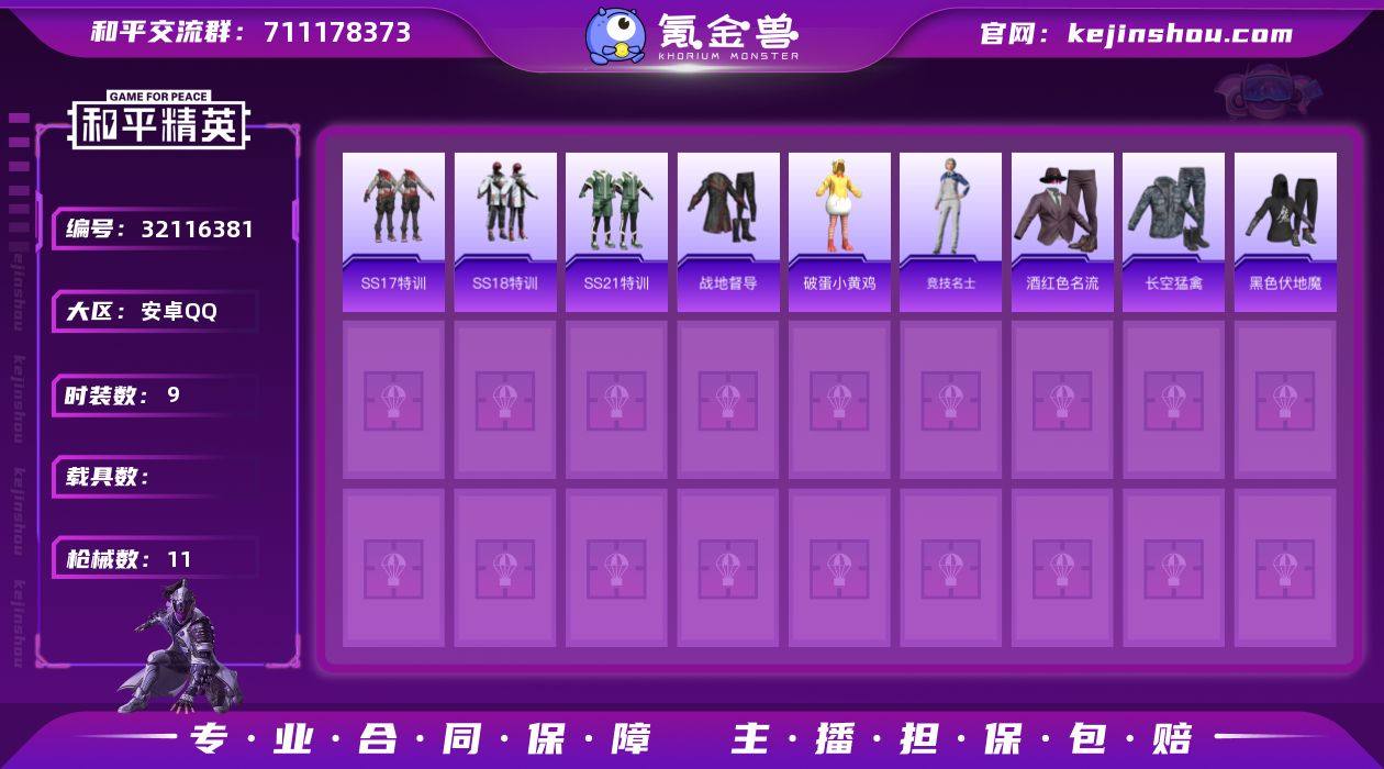 XY253 安卓 手Q-0粉装-0特效枪-0载具-0粉色飞行器-3588热力值-1王牌印记-9套装-11枪皮 【稀有枪皮】:AKM-破晓战魂,AKM-霓虹街区,SCAR-L-炫彩节奏,M416-红色方程式,AC-VAL-天降萌叽,UMP45-蓝色火焰,Mini14-炫彩节奏 【其他套装】:套装-SS17特训,套装-SS18特训,套装-SS21特训,套装-战地督导,套装-破蛋小黄鸡,套装-竞技名士,套装-酒红色名流,套装-长空猛禽,套装-黑色伏地魔 【营地ID】:1026550864