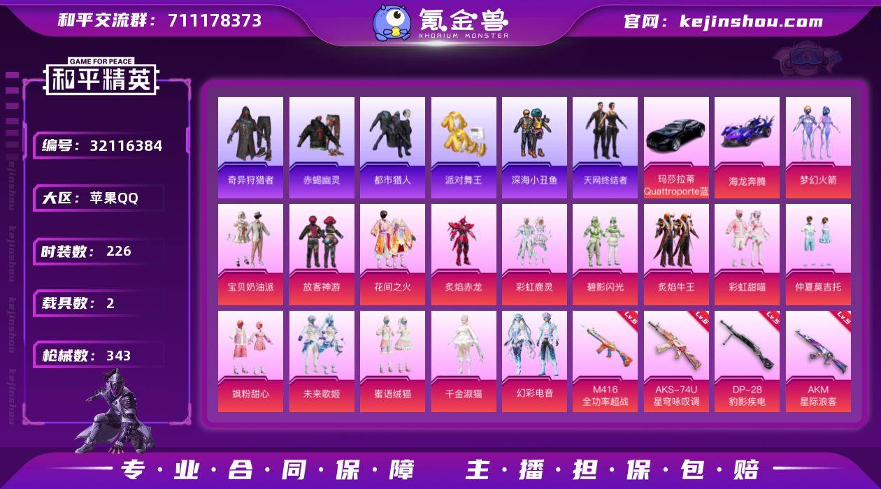 【1765】苹果 手Q-15粉装-14特效枪-2载具-4粉色飞行器-115036热力值-21王牌印记-226套装-343枪皮 【热门品类】:粉装-梦幻火箭,套装-浪漫天命,套装-赤蝎幽灵,套装-都市猎人,套装-派对舞王,套装-深海小丑鱼,套装-奇异狩猎者,套装-天网终结者,套装-忍者信条,套装-龟仙人,套装-暗影哥特,角色-8号机,角色-Mark.06 【粉色套装】:粉装-宝贝奶油派,粉装-梦幻火箭,粉装-放客神游,粉装-花间之火,粉装-炙焰赤龙,粉装-彩虹鹿灵,粉装-碧影闪光,粉装-炙焰牛王,粉装-彩虹甜喵,粉装-仲夏莫吉托,粉装-飒粉甜心,粉装-未来歌姬,粉装-蜜语绒猫,角色-千金淑猫,粉装-幻彩电音 【粉色枪皮等级】:AKM-梦之光华(三级),AKM-星际浪客(五级),SCAR-L-青春物语(五级),M416-五爪金龙(二级),M416-全功率超战(六级),M416-超新星(三级),GROZA-镜光银凌(五级),AUG-暖羊咩咩(五级),AKS-74U-星穹咏叹调(六级),Kar98K-巳巳如意(五级),Mk14-甜梦熊击(五级),Mk14-福马献瑞(三级),M417-第五大道(四级),DP-28-豹影疾电(五级) 【粉色载具】:玛莎拉蒂Quattroporte(夜幕蓝),海龙奔腾,僚机-萌兔起飞 【粉色枪皮】:AKM-梦之光华,AKM-星际浪客,SCAR-L-青春物语,M416-五爪金龙,M416-全功率超战,M416-超新星,GROZA-镜光银凌,AUG-暖羊咩咩,AKS-74U-星穹咏叹调,Kar98K-巳巳如意,Mk14-甜梦熊击,Mk14-福马献瑞,M417-第五大道,DP-28-豹影疾电 【粉色飞行器】:炫彩糖果飞行器,伏魔团飞行器,甜蜜誓约飞行器,雀灵庇佑飞行器 【粉色降落伞】:至尊龙雀降落伞,梦幻火箭降落伞,甜蜜誓约降落伞,童趣迷兔降落伞,怪笑疯兔降落伞,蓝莓炮弹降落伞,碧影闪光降落伞,炙焰牛王降落伞,荒漠赏金降落伞,环太平洋降落伞,垂柳戏鸭降落伞,太空嘟嘟降落伞,彩虹甜喵降落伞,千面幻镜降落伞,旋转彩虹降落伞,青空秋...